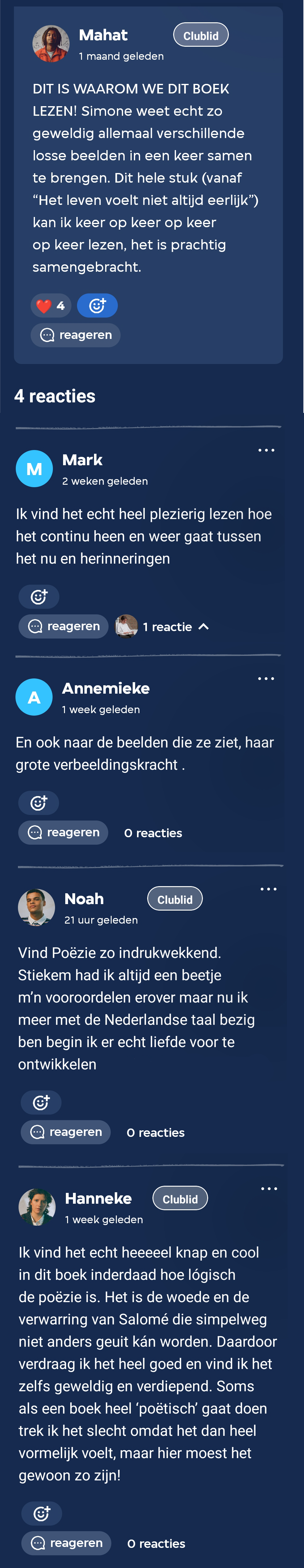 Het is dan ook niet vreemd dat het de lezers opviel hoe poëtisch dit boek geschreven is. Mahat, die het boek gekozen heeft, is zelf ook dichter, en kon goed aanwijzen wat er zo dichterlijk is aan de woorden in dit boek. Hanneke zei dat ze de poëtische taal heel ‘logisch’ vond; het had echt een functie. De poëzie versnelt en trekt je mee in de gevoelens van Salomé.