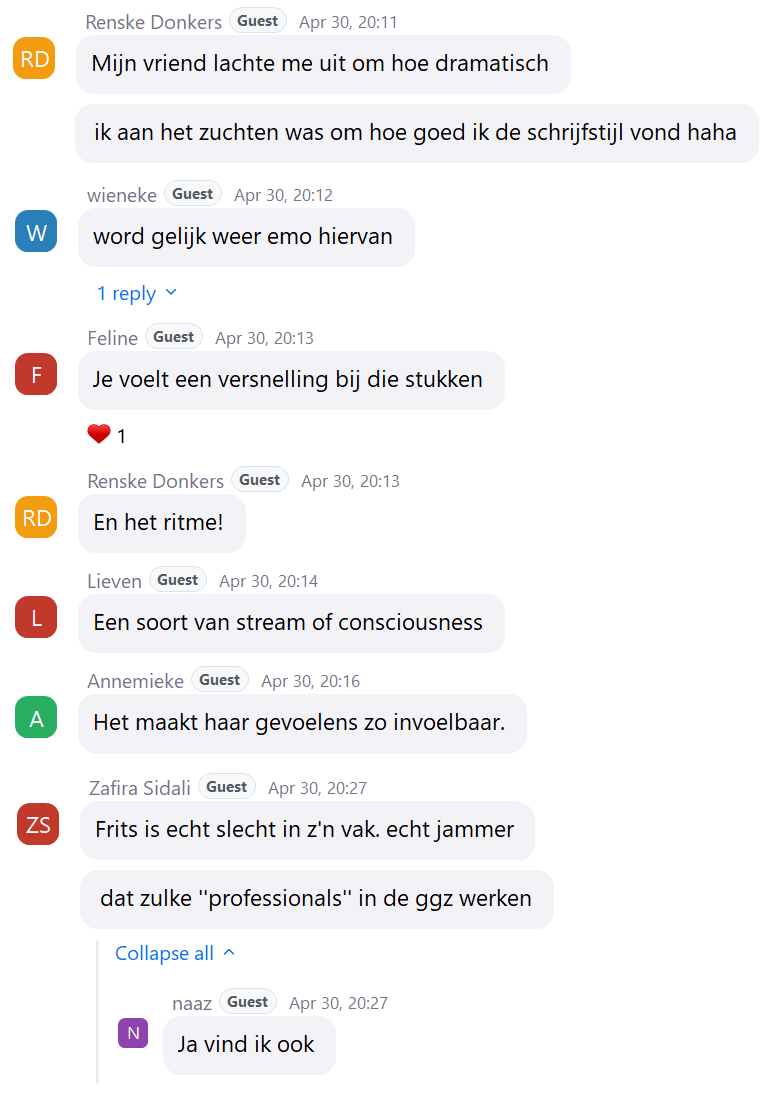 Een ander gesprek dat veel losmaakte, ging over de rol van hulpverlening en de verhouding tussen Salomé en haar psycholoog Frits. ‘Frits is echt slecht in z’n vak,’ vond Zafira. Mahat benadrukte hoe belangrijk het is om een goede hulpverlener te treffen, terwijl Hanneke een structureel probleem benoemde: ‘Er werken daar allemaal witte, mannelijke therapeuten. Die begrijpen de realiteit van jonge vrouwen van kleur vaak niet.’ Veel lezers zagen pas verbetering toen Salomé zelf afstand nam van Frits. Het boek maakte duidelijk hoe bepalend iemands omgeving is voor wie je wordt. ‘Je komt er door dit boek heel erg achter hoe je gevormd wordt door je directe omgeving,’ vatte Mahat samen. Confrontaties riep dan ook bij iedereen veel emoties, associaties en gedachten op. De meetup werd een persoonlijk en open gesprek. Zoals Renske zei: ‘Heel erg bedankt voor alle open gesprekken vanavond, heel bijzonder dat we hierbij mochten zijn!’