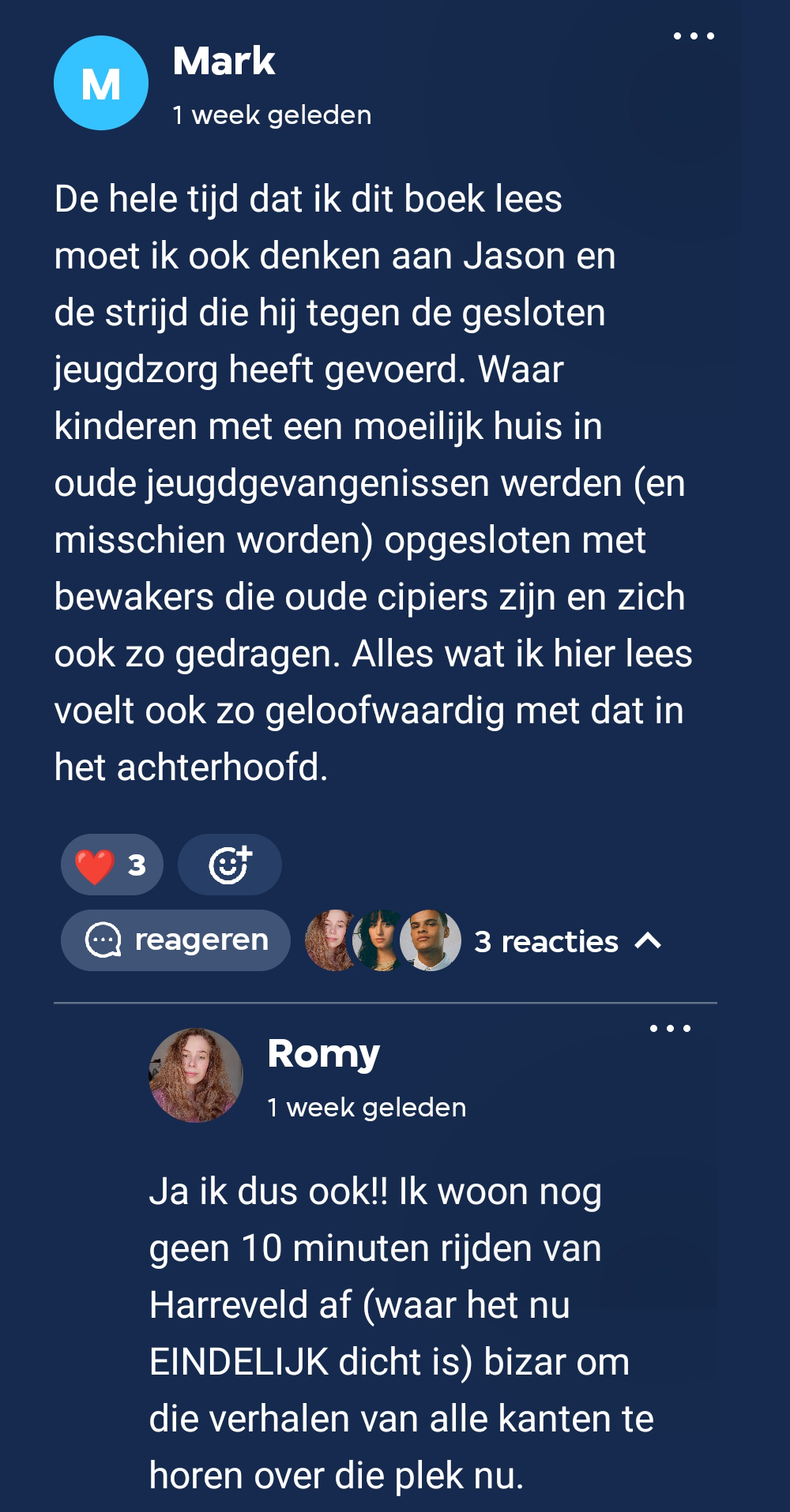 Opgroeien is al moeilijk op zich, maar als je opgroeit in een gevangenis of instelling wordt het nog moeilijker. De manier waarop de jeugdgevangenis in Confrontaties wordt beschreven, deed Mark denken aan de gesloten jeugdzorg in Nederland. ‘Kinderen met een moeilijk thuis werden opgesloten in oude jeugdgevangenissen, met oude cipiers die zich nog steeds zo gedroegen.’ Gelukkig is er inmiddels meer bewustwording, mede dankzij mensen als Jason Bhugwandass, die zich als ervaringsdeskundige jarenlang inzette voor verandering. De locatie in Harreveld is inmiddels gesloten — een klein maar belangrijk teken dat er iets in beweging komt.