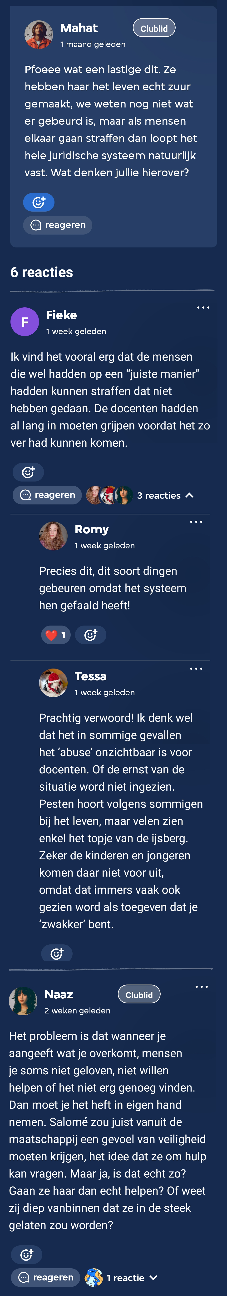 In Confrontaties nemen een aantal mensen het heft in eigen hand. Salomé is daar één van. Het zorgt voor een levendige discussie in de kantlijn: Zijn Salomé’s acties rechtvaardig? Fieke merkte op: ‘Ik vind het vooral erg dat de mensen die wel op een “juiste manier” hadden kunnen straffen, dat niet hebben gedaan.’ Denk aan docenten die pesten of mishandeling niet signaleren. En zelfs als je problemen wél benoemt, word je niet altijd serieus genomen, benadrukte Naaz: ‘Salomé zou juist vanuit de maatschappij een gevoel van veiligheid moeten krijgen. Maar ja, is dat zo?’