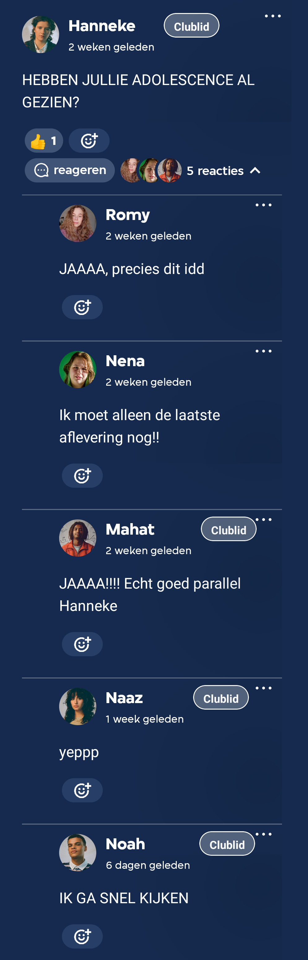 Het is makkelijk om te vergeten hoe het was om zo jong te zijn, zegt Naaz. ‘Als je als volwassene al lang niet omringd bent door kinderen, krijg je zo’n schattig, idyllisch beeld van kind zijn.’ Maar in de realiteit gaat het er veel harder aan toe. Dat lezen we in Confrontaties, maar is ook een belangrijk thema in de Netflix-serie Adolescence, die uitgebreid werd aangeraden in de app. Beide werken laten zien dat opgroeien allesbehalve zorgeloos is, en al helemaal niet als je omgeving onveilig is.