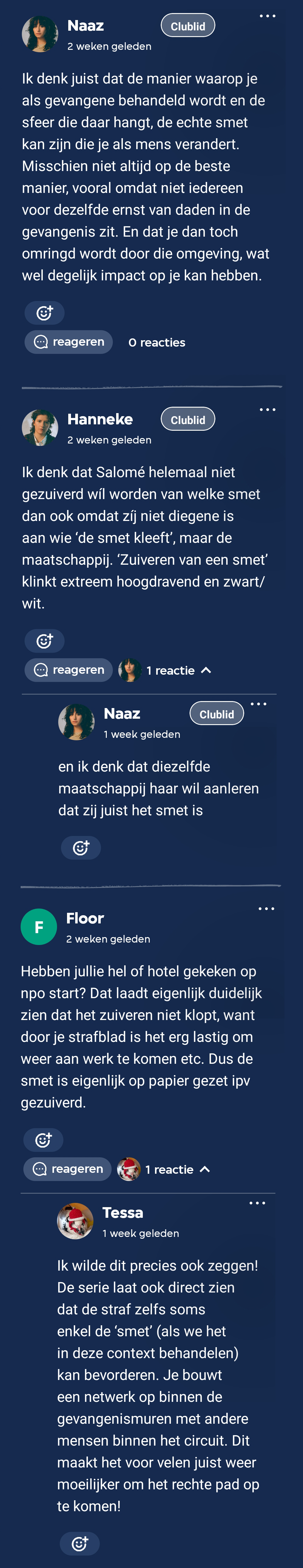 Dat Salomé uiteindelijk in een jeugdgevangenis belandt, roept vragen op over het nut van straf. Mahat vroeg het eerder ook aan Veerle Hammerstein, in een video-interview: werkt zo’n straf eigenlijk wel? In de kantlijn van de meetup ontstond een gesprek over het idee dat gevangenschap iemand zou moeten ‘zuiveren’ van de ‘smet’ die aan hen kleeft. Hanneke reageerde daarop: ‘Ik denk dat Salomé helemaal niet gezuiverd wil worden, omdat de “smet” niet aan haar kleeft, maar aan de maatschappij.’