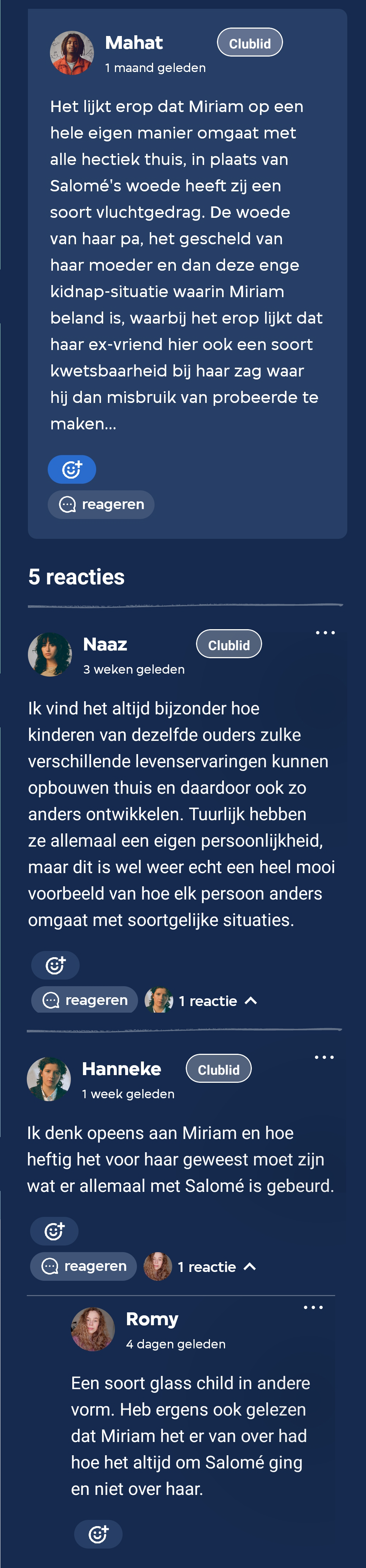 Bij de meetup van 30 april kwam één ding heel duidelijk naar voren: Confrontaties maakte indruk. ‘Dit was mijn favoriete boek tot nu toe bij Club Lees,’ zei Hanneke. ‘Zo’n dun boek, en toch zoveel lagen.’ Toch verschilden de lezers in hun interpretatie van het einde. Noah hield er een hoopvol gevoel aan over, ondanks de zwaarte van het verhaal. Naaz vond het boek verdrietig, omdat ze zich zo goed kon inleven in Salomé’s situatie, maar voegde daaraan toe: ‘Ze is nog zo jong, ze heeft haar hele leven nog voor zich.’ Voor Hanneke voelde het slot niet hoopvol, maar vooral realistisch: 'ze heeft al te veel meegemaakt voor haar leeftijd’.