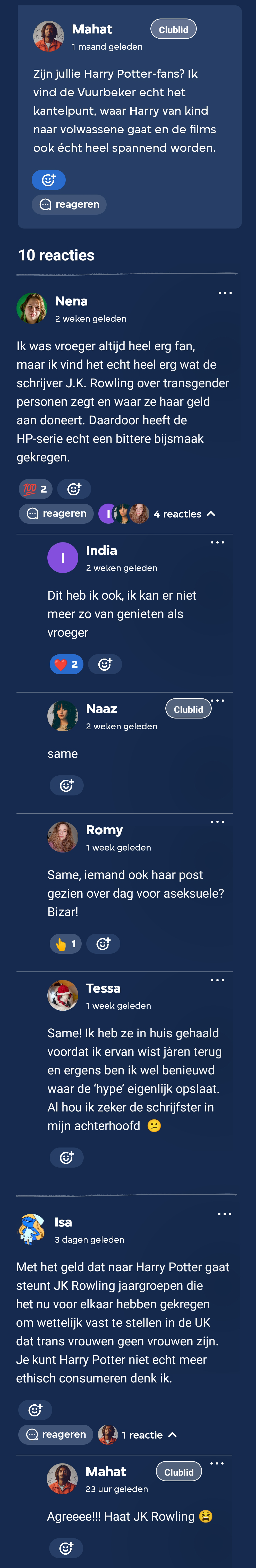 Literatuur speelt een grote rol in Confrontaties; Salomé verslindt boeken, er komen allerlei titels voorbij. In dit artikel hebben wij alle boektitels op een rijtje gezet en uitgelegd waarom ze belangrijk zijn voor het verhaal. Eén titel ontbreekt in dat overzicht, maar kwam wél ter sprake tijdens de meetup: Harry Potter. Veel lezers zijn met deze serie opgegroeid, maar kijken er inmiddels met gemengde gevoelens naar. ‘Het heeft een bittere bijsmaak gekregen door de acties van J.K. Rowling,’ zei Isa. ‘Met het geld dat zij verdient met de franchise, steunt ze jaargroepen die het voor elkaar hebben gekregen om wettelijk vast te stellen in het Verenigd Koninkrijk dat transvrouwen geen vrouwen zijn.’