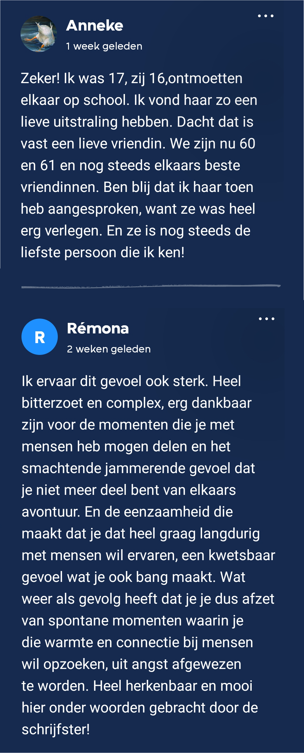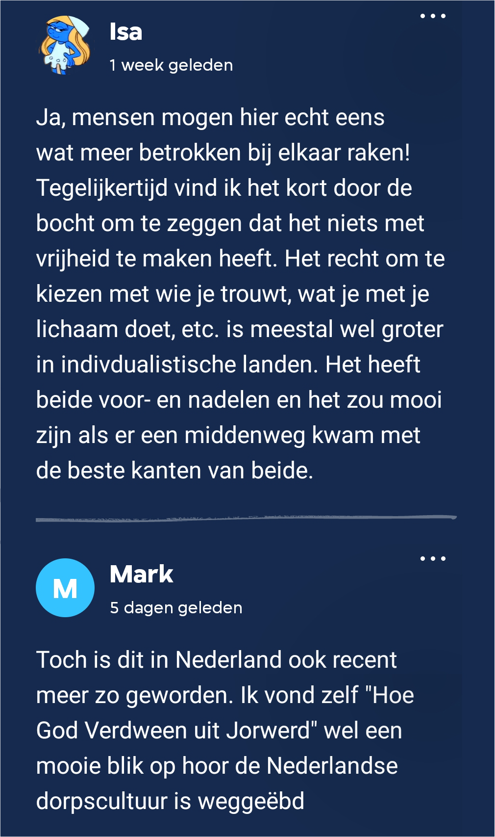 Het hoofdpersonage in dit boek mist het gevoel van samenzijn uit Iran. Nederland is een veel individualistischer land. Hier hebben de vier clubleden tijdens een live meet-up op het literatuurfestival Writer’s Unlimited uitgebreid bij stilgestaan. Ook schrijfster Sholeh Rezazadeh was daarbij aanwezig. Isa vond dat mensen hier veel meer betrokken met elkaar zouden mogen zijn, maar dat we niet mogen vergeten dat we in onze cultuur ook heel veel vrijheid ervaren. Mark zegt dat we vroeger ook veel meer in gemeenschap leefden, vooral in kleinere dorpen, zo las hij in Hoe God verdween uit Jorwerd van Geert Mak.