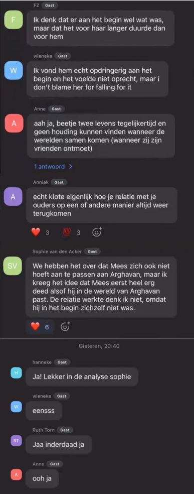 Alicia merkte op dat Mees pas interesse verloor in Arghavan “toen hij haar in zijn vriendengroep bracht. Toen werd het contrast heel duidelijk tussen haar en de rest van zijn wereld.” Hanneke herkent wel wat van zichzelf in Mees: “Ik denk weleens dat ik iemand leuk vind, maar eigenlijk ben ik eerder door ze gefascineerd.” Volgens haar had Mees dat ook. Sophie zei dat Mees in het begin heel erg deed alsof hij in de wereld van Arghavan paste, terwijl dat eigenlijk niet zo was.
