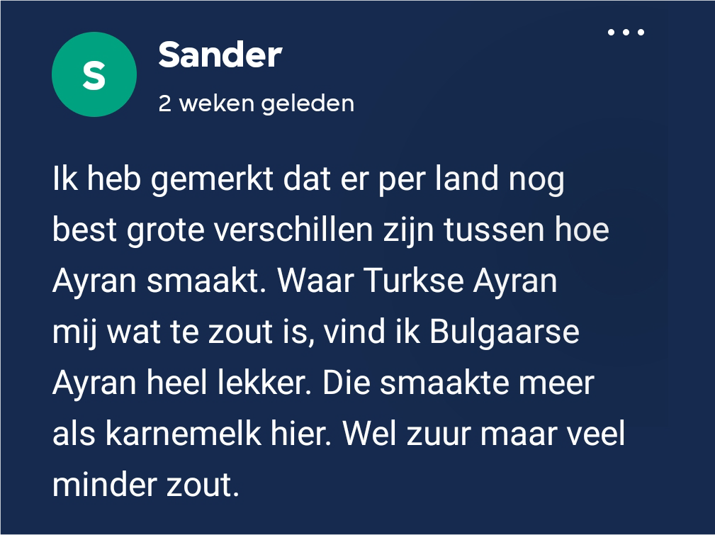 In het boek zelf komt het drankje ayran voor, dat Naaz ook kent uit haar jeugd. “Het is een soort Midden-Oosterse ‘wijn’,” vertelt ze, “soms wordt ayran jarenlang gefermenteerd, waardoor het heel zuur wordt en op die manier gedronken kan worden. Bij mijn ouders, en ook bij ooms en tantes, stonden er altijd gigantische tonnen ayran in de schuur of in de tuin om te fermenteren.” Sander merkte op dat ayran in verschillende culturen een andere smaak heeft: