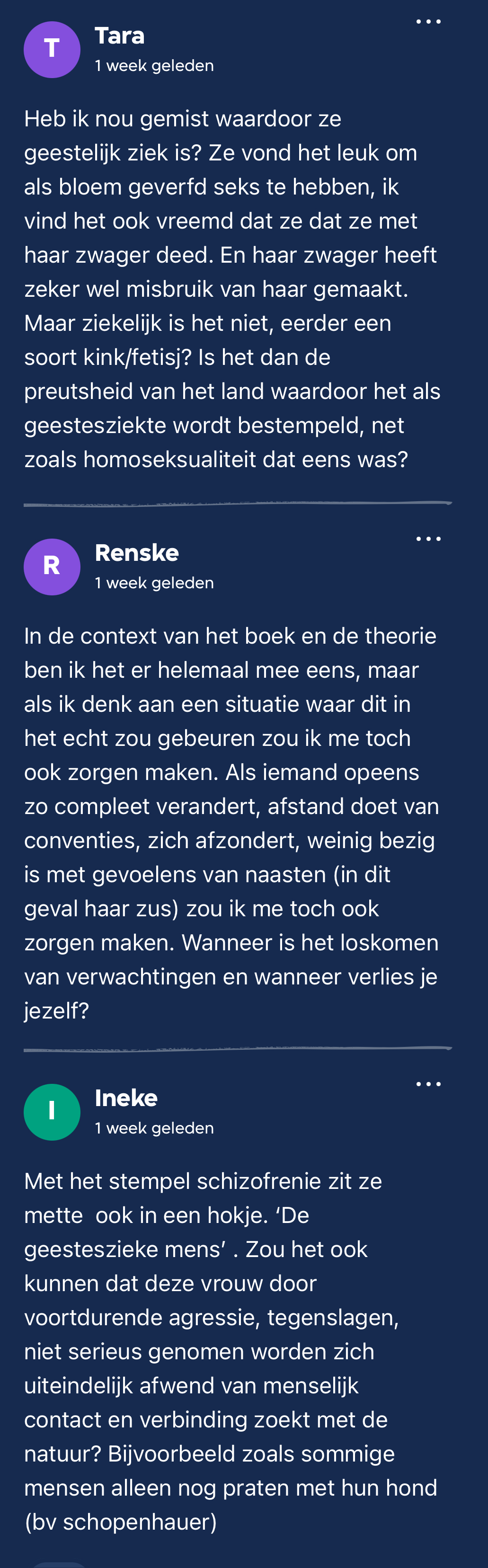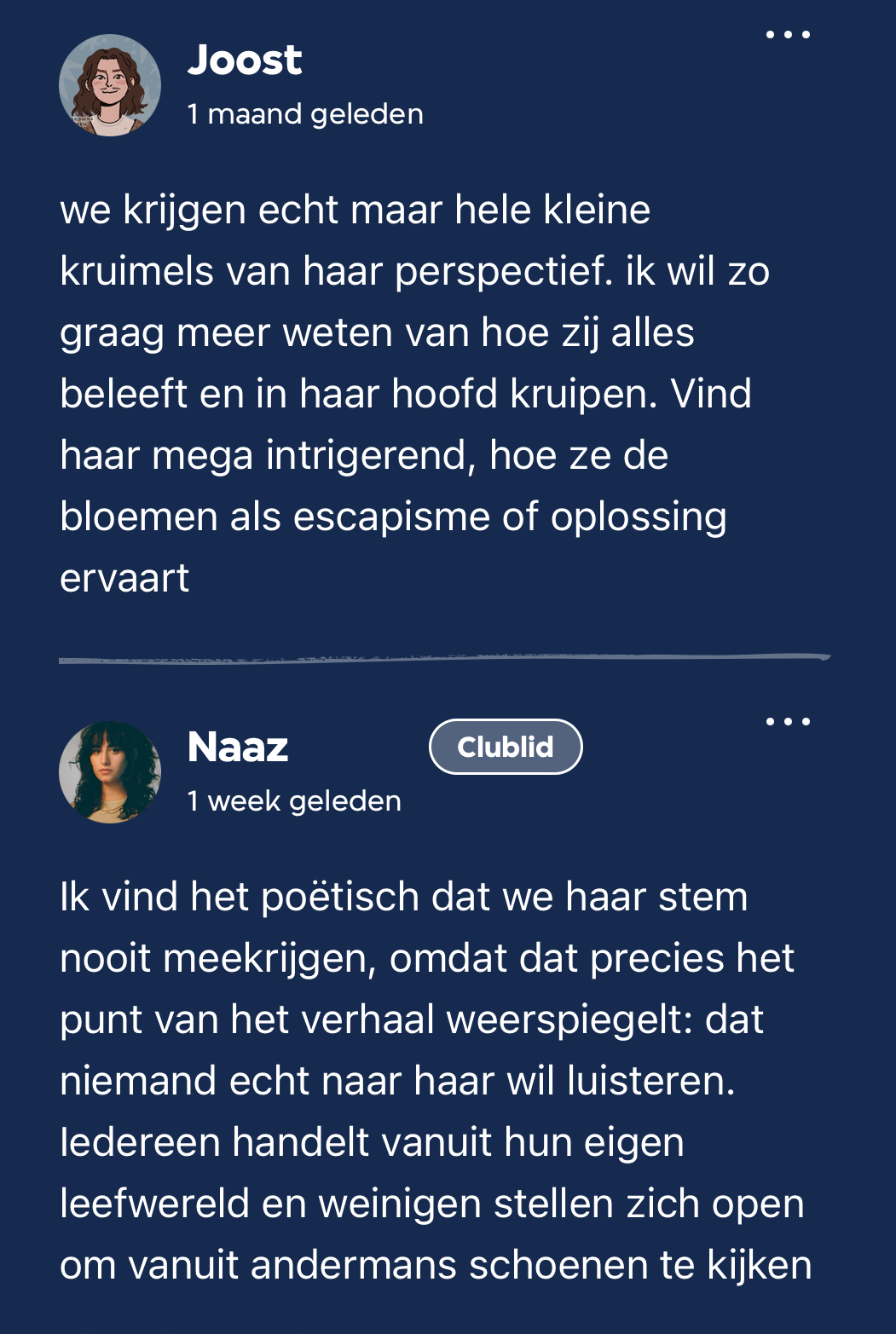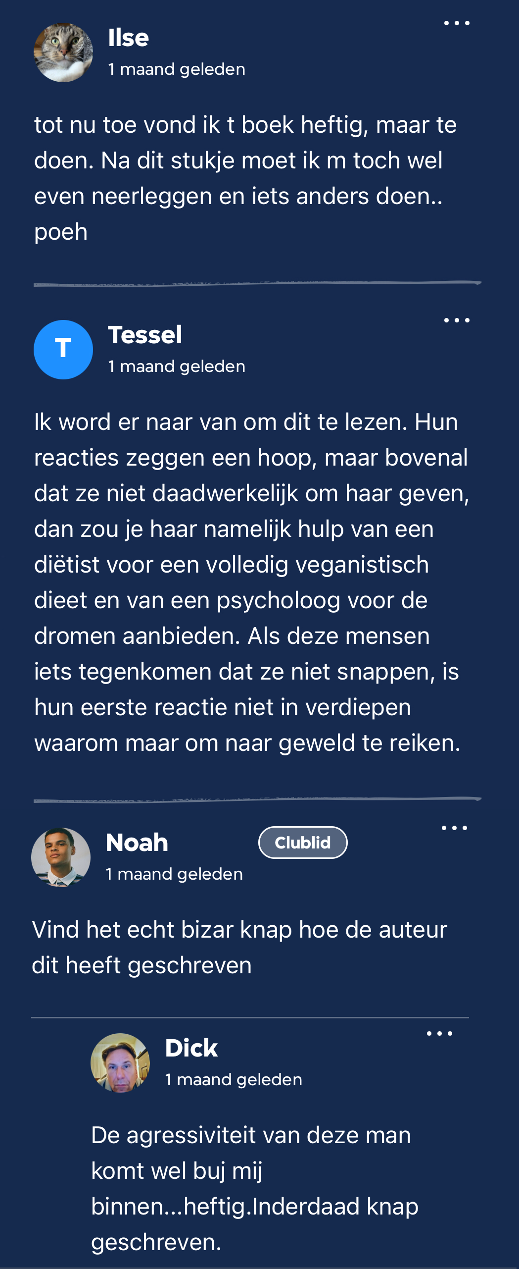 Er was dus aardig wat om over na te denken en over te kunnen praten bij dit tweeëntwintigste Club Lees boek. J. vertelde dat die even moet bijkomen van al het fysieke geweld in dit verhaal. ‘Als dit niet een Club Lees boek was, had ik het halverwege deel 1 na de aanranding weggelegd. Door toch door te lezen begrijp ik beter waarom de auteur prijzen heeft gewonnen.’ Ook lezers Isa en Stéphanie deelden hun ervaringen met het boek, met als overlappende factor: de eerste twee delen waren wel heel heftig, maar deel drie was fijner en mooier. Hanneke werd onder meer door Dick, Joost en Ilse bedankt voor haar bijdragen aan, en het kiezen van, het boek. Ook veel van de deelnemers in de meet-up waren enthousiast. Tara: ‘Het was een waanzinnige beleving om dit boek te lezen, super fijn om dit met jullie allemaal te kunnen bespreken en dat we gedachtes met elkaar konden delen <3.’ Voor Esmay en Fleur was dit hun allereerste Club Lees meet-up (welkom!) (30 en 31) en ze waren gelukkig enthousiast. Wil jij nou ook gezellig live het boek bespreken? Sluit dan gezellig aan bij onze eerstvolgende meet-up! Toch niet in de mogelijkheid om aan te sluiten? Geen probleem, praat gezellig mee in de kantlijn.