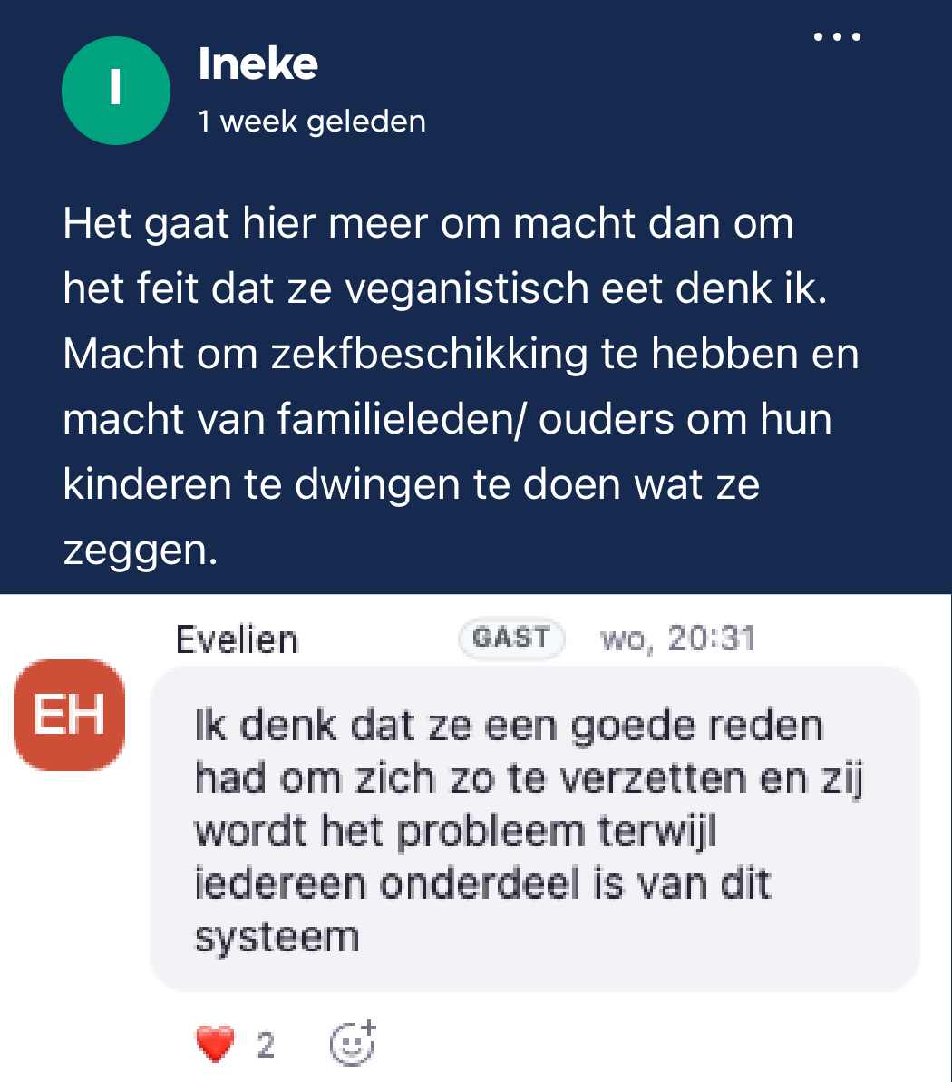 De verschillende gewelddadige uitingen in het boek werden besproken in de kantlijn en tijdens de meet-up en wat meer geduid. Ineke zag dat het vaker om macht gaat dan om het feit dat Yeong-hye veganistisch eet. ‘Macht om zelfbeschikking te hebben en macht van familieleden/ouders om hun kinderen te dwingen te doen wat ze zeggen.’ Niet zo gek dus dat Yeong-hye hier op een gegeven moment (symbolisch) tegenin gaat dus, vond ook Evelien: ‘Ik denk dat ze een goede reden had om zich zo te verzetten en zij wordt het probleem terwijl iedereen onderdeel is van dit systeem.’