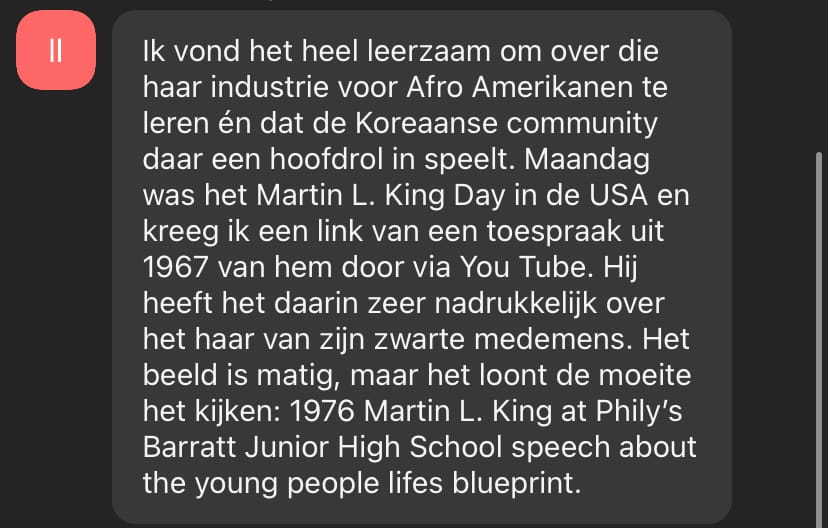 Een overlapping tussen de twee culturen waren de Afro Shops in het verhaal. De ouders van Daniël zijn een van de vele Koreanen in de Verenigde Staten die een afro shop runnen, een winkel waar zwarte mensen allerlei producten kunnen kopen voor hun haar. In de meetup vragen mensen zich af waarom Koreanen deze winkels runnen. Lemuel zegt: ‘’In Suriname werden alle afro shops gerund door Chinezen, dat vond ik ook opvallend.’’ Noah zegt: ‘’Van origine kwam het haar voor de wigs van mensen uit China en Korea die hun haar afknipten om daar hoge kwaliteit pruiken van te maken.’’