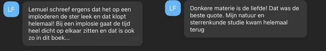 Nelleke was ook bij de meetup aanwezig en vertelde hoe leuk ze het vond om met Noah over de sterren te praten. ‘’Ik heb in de video ook een shirt aan met sterretjes erop, dat was per ongeluk en had ik pas door toen er tijdens het filmen naar gevraagd werd, haha!’’ Na de theorieën over het heelal, ontstaat er een gesprek in de meetup over de theorieën die toepasbaar zijn op het boek. In de meetup haalt een lezer een reactie van Lemuel uit de app aan en vertelt haar eigen theorie.