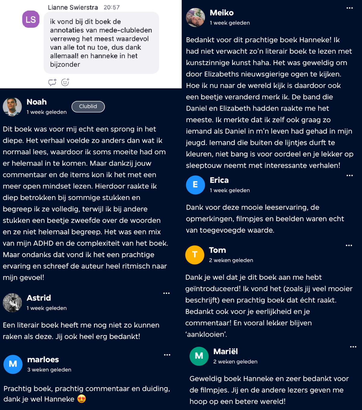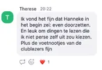 In de kantlijn aan het einde van het boek en de meet-up delen veel lezers hun leeservaring. Hanneke ontving veel complimenten van lezers over haar notities - ook voor mensen die Herfst geen fantastisch boek vonden, sleepten haar opmerkingen hen er doorheen.