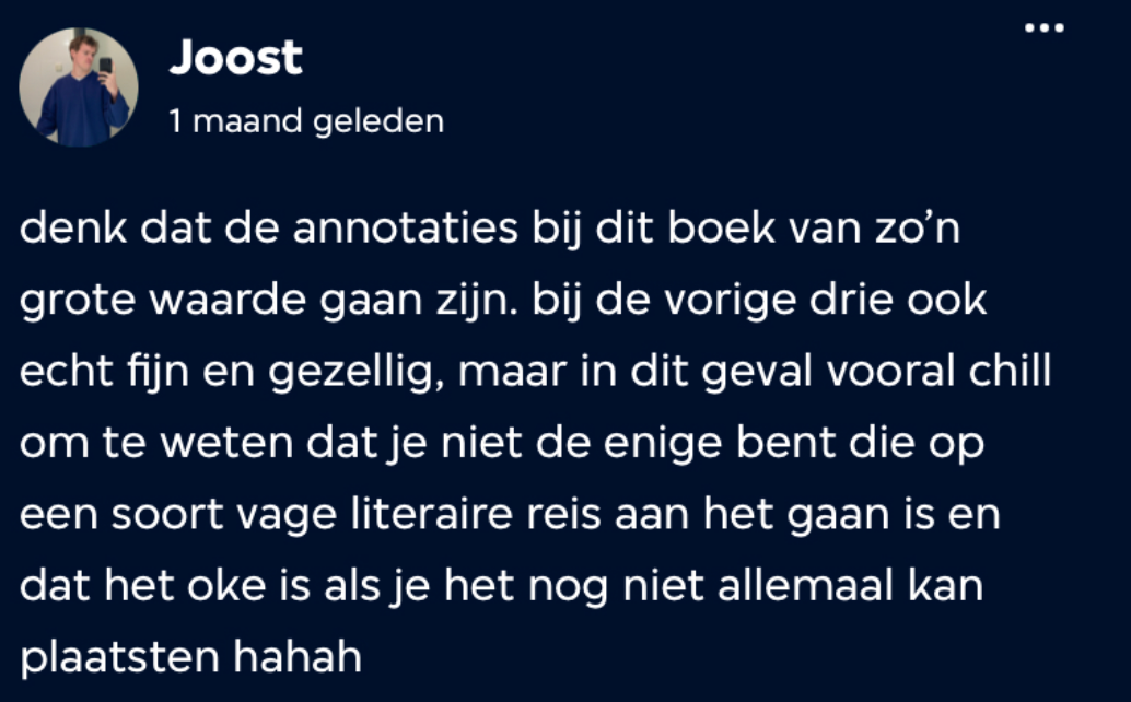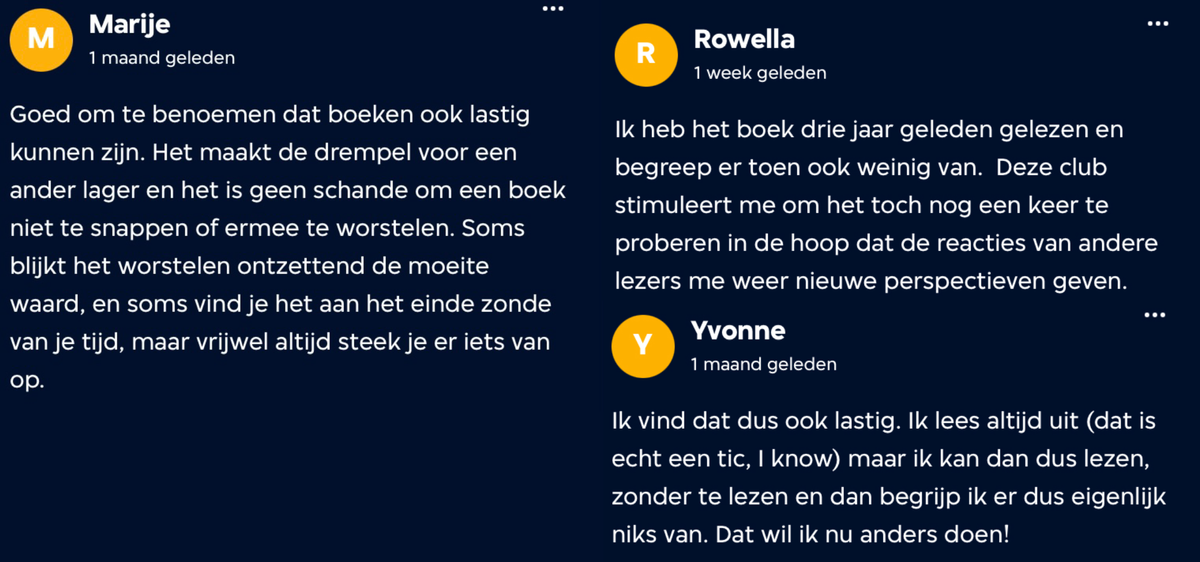 Daarnaast heeft Hanneke schrijver en dichter Joost Oomen ingeschakeld als literaire hulplijn, om ons handje vast te houden bij de lastigere stukken. Met zijn tips - en vooral geruststellende woorden - worden we verder op weg geholpen in het boek. Maar lang niet iedereen heeft zijn hulp nodig, want we hebben ook een hoop mee-lezers die dol zijn op moeilijke boeken. Zo zegt Jonathan: “Ik eet ze voor ontbijt”, en zijn ze voor Greta het ideale anti-stress middel.