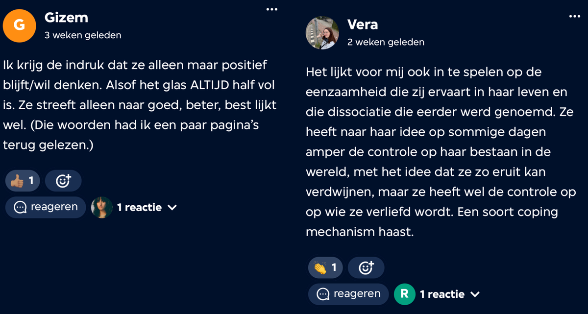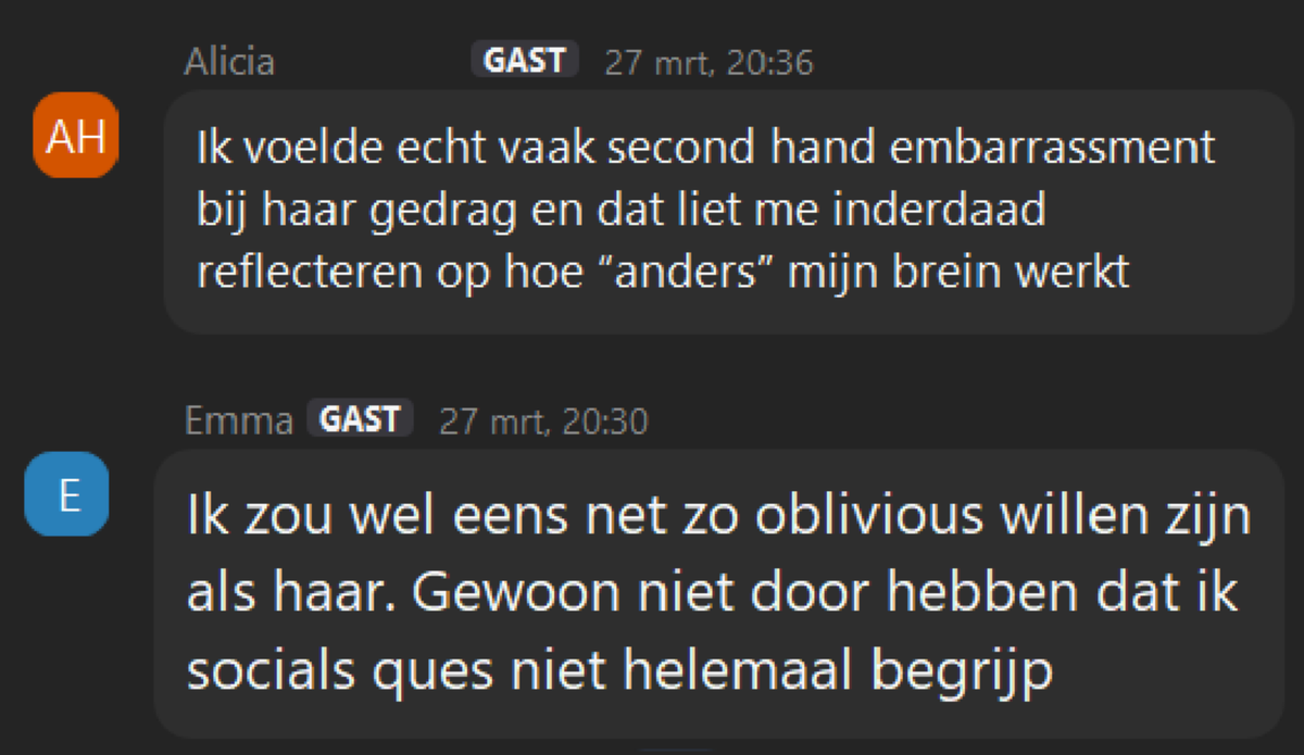 Voor clublid Noah was dit herkenbaar: "Toen ik op de middelbare school zat sprak ik nooit af met mensen en was ik heel erg op mezelf en ik vond het heel fijn om te zien dat Eleanor toch vrienden kreeg. Ik ben neurodivergent, bij haar merkte ik dat ook. Ik ben heel zelfbewust, zij ook maar op een hele andere manier dan ik. Ik denk dat dat komt omdat ze geen ouders had en ik wel. Eleanor had geen tegengeluid vanuit haar omgeving."