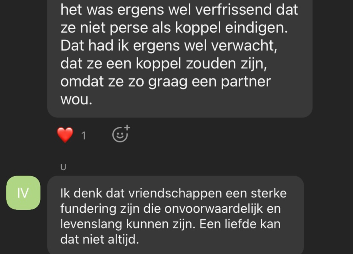 ‘’Ik vond Eleanor en Raymond heel leuk. Ik vond het leuk dat ze de tijd kregen om de band te definiëren. Ik vond dat heel mooi.’’ zegt Hanneke tijdens de meet-up.