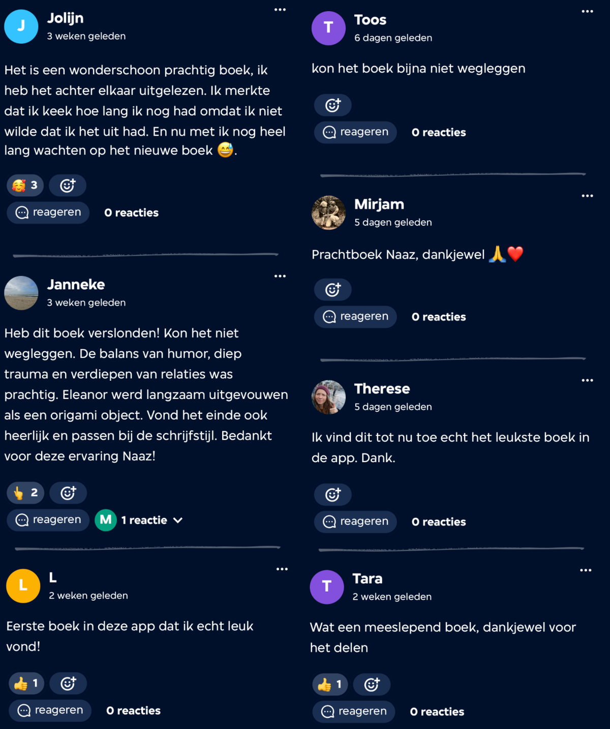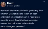 Tijdens de meet-up krijgt een lezer uit de app, Kitty, het woord: ‘’Ik vond dus de verhaallijn tussen Raymond en Eleanor heel tof en voor mij werd het niet perse duidelijk of het romantische lijn en platonische lijn was. En als iemand die zelf heel erg staat voor platonische liefde en niet romantische liefde en het was mooi dat het open werd gehouden. Eleanor had gewoon liefde nodig, in welke vorm dan ook.’’