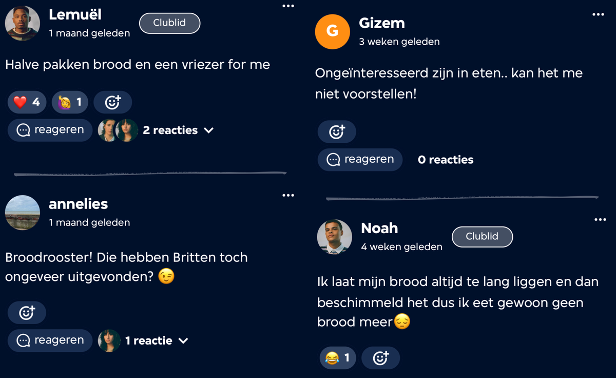 In de app blijken er onder de lezers ook veel verschillende eetgewoontes te bestaan. In de meetup vult Noah aan: ‘’Ze maakt alleen maar pasta pesto en toen dacht ik, ja dat doe ik ook want ik haat na te denken over eten.’’