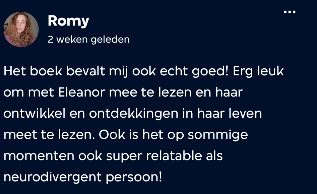 Hanneke vond het neurodivergente aspect van Eleanor juist moeilijk, vertelt ze tijdens de meetup: ‘’Ik kon de schrijfstijl daardoor niet geloven. Ik ben neurotypisch dus ik vond haar gedachten en gedrag echt onvoorstelbaar.’’ Naaz reageert: "Hanneke, ik dacht hier nog aan, ik kon begrijpen dat als je het niet leeft dat het dan te letterlijk geschreven lijkt. Als je het niet ervaren hebt kan het best plat overkomen’’ Hanneke antwoord: ‘’Ja, het komt op mij over als een schrijfstijl terwijl andere lezers denken: dit is hoe mijn brein werkt.’’