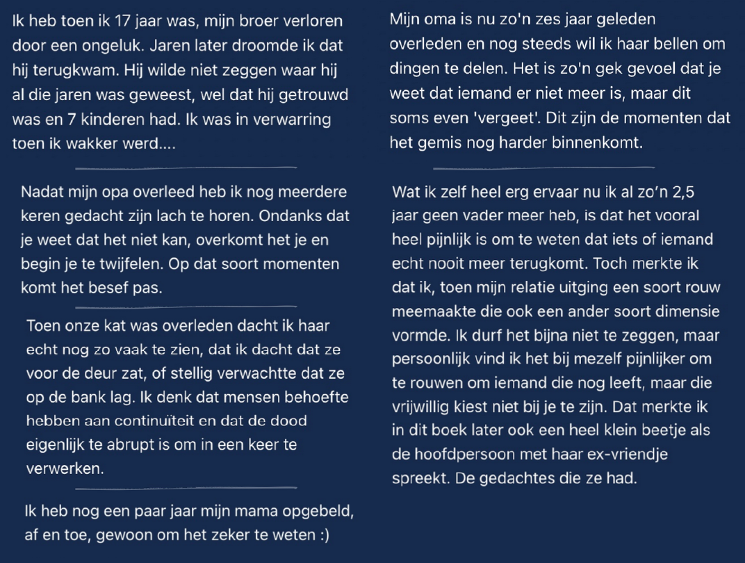 ‘’Ik vond het bijzonder hoeveel mensen in de kantlijn iets deelden over hun rouwproces. Iedereen was erg open en dat zorgde voor mooie gesprekken’’, vertelt Hanneke tijdens de meet-up. In de meet-up vult een meelezer, Tessa, haar aan: ‘’Ik kon heel moeilijk praten over rouw en omgaan met rouw. Tijdens het lezen van dit boek overleed mijn lieve konijn, dat zette alles veel meer in perspectief en het boek heeft mij vervolgens geleerd hoe ik met rouw om moet gaan.’’