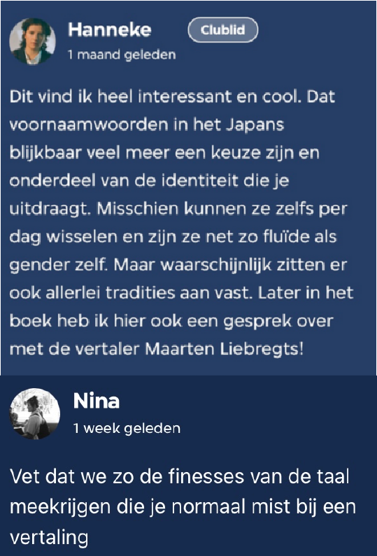 Het Japans en het Nederlands staan als talen ver uit elkaar, net zoals de culturen heel verschillend zijn. Tijdens de meetup sluit de vertaler van Kitchen, Maarten Liebregts, aan om te vertellen hoe zo’n vertaalproces in z’n werk gaat. Zo komt een van Hanneke’s favoriete zinnen niet voor in een eerdere Engelse vertaling van het boek.