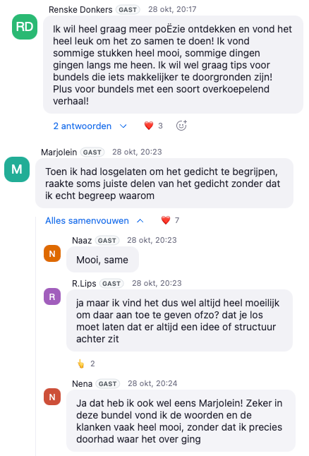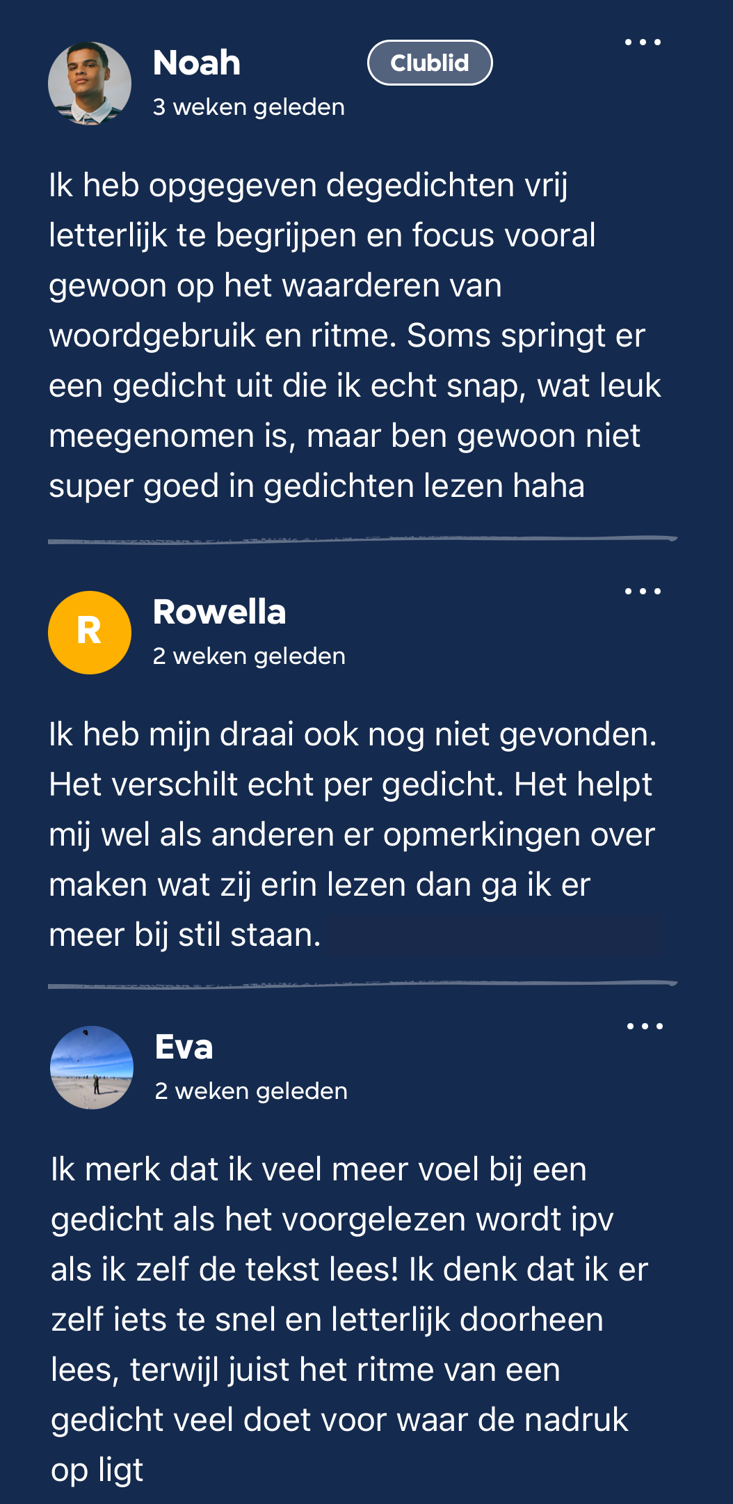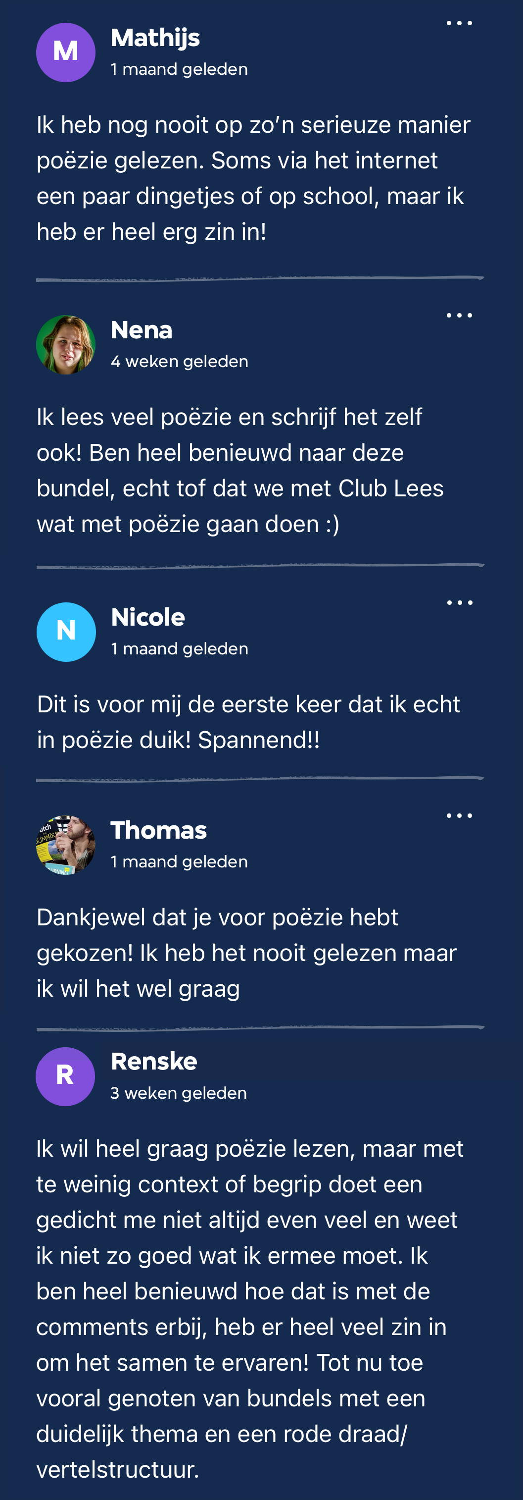 Voor de ander is gedichten lezen haast alledaagse kost. AC leest af en toe poëzie en schrijft het zelfs! Hetzelfde geldt voor Nena: "Echt tof dat we met Club Lees wat met poëzie gaan doen :).” Lisanne leest poëzie vooral voor de vertraging. Eén of een paar stukjes per dag, zodat ze het kan laten bezinken. Wat voornamelijk opvalt is dat iedereen open staat voor een nieuwe leeservaring; “Dankjewel dat je voor poëzie hebt gekozen! Ik heb het nog nooit gelezen, maar ik wil het wel graag”, zegt Thomas.