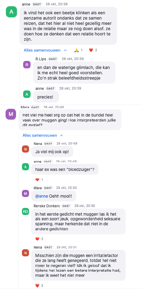 Annemieke reageert enthousiast op Mahat: “Ik vond het best vet! [...] Ik vond je notities erg waardevol, thanks voor alle inzichten!!”. De notities van onder meer Mahat in de kantlijn werden door meerderen gewaardeerd. Bep: “Dank voor jouw keuze en toelichting, daar heb ik veel aan gehad. Ook dank aan iedereen voor de reacties.” Noah sluit zich hier graag bij aan: “Ik vond het heel interessant! [...] Jouw aantekeningen, Mahat, waren enorm waardevol.”
