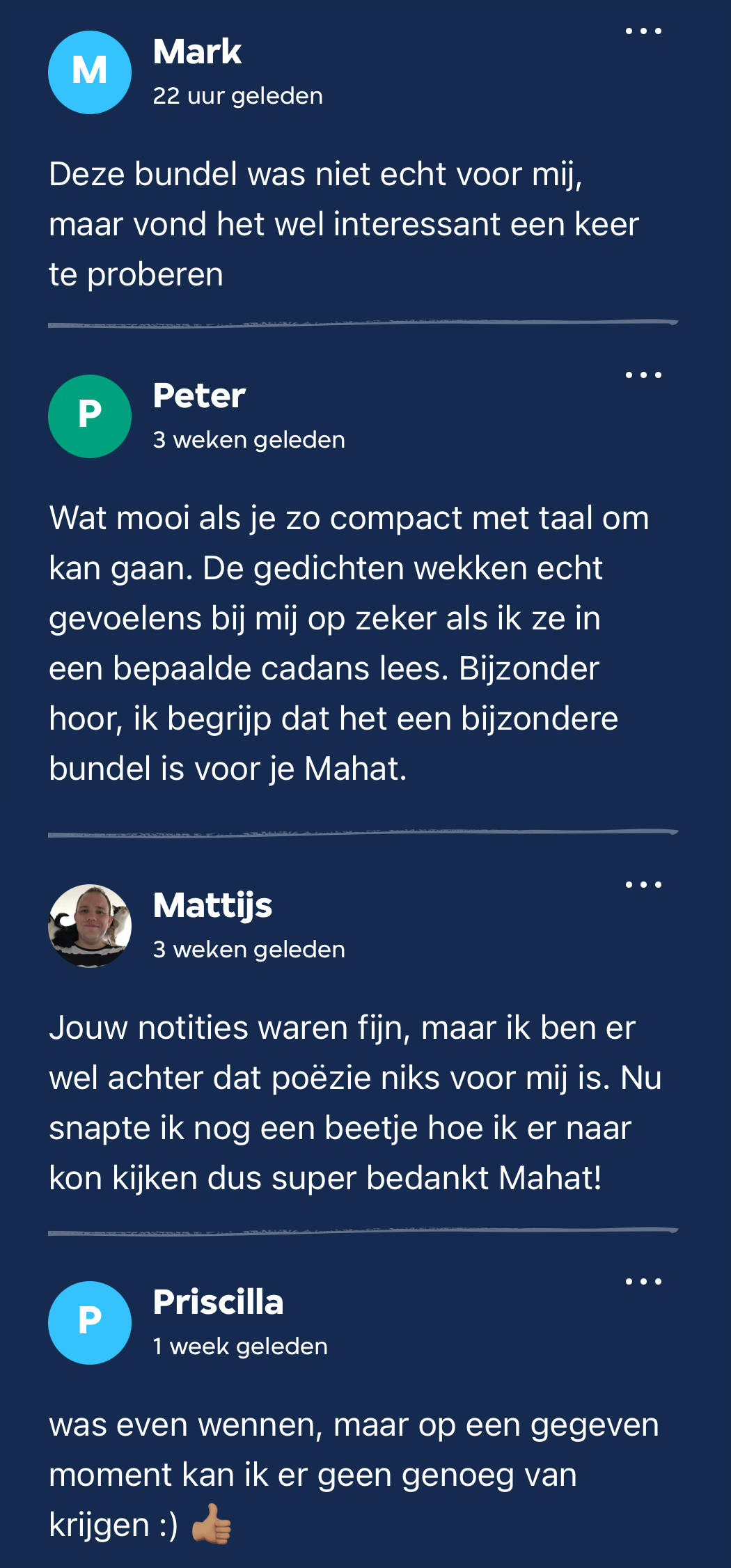 Door de leesoefeningen van Mahat ontpopte sommige lezers zich tot echte poëziekenners. Zoals Marije die haar haar interpretatie deelt van het gedicht V: “Ik lees nostalgie, een verlangen naar het verleden en een weten dat dat verleden voorbij is. Berusting ook.” Rowella leest: "Woorden als een geknelde zenuw, bij de keel grijpen, langdradig verwijzen naar de rek die uit de relatie is en verstikkend wordt.” Mooi he? “Ik vind het ook een beetje klinken als een eenzame autorit ondanks dat ze samen reizen, dat het hier al niet heel gezellig meer was in de relatie maar nog doen alsof.”, analyseert Anne tijdens de meetup. “En dan de waterige glimlach, die kan ik me echt heel goed voorstellen. Zo’n strak beleefdheidsstreepje”, voegt Roos toe.