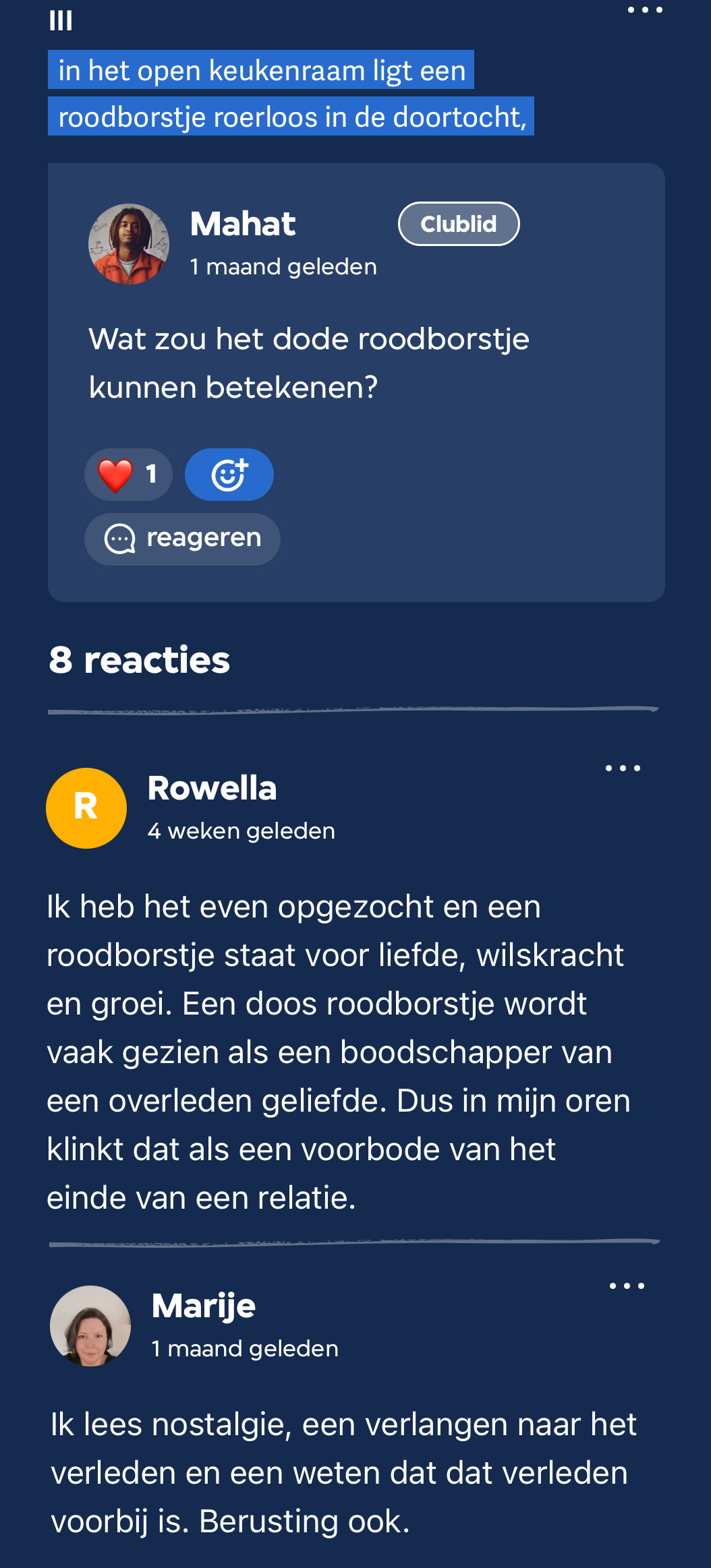 Mahat gaf opzetjes zoals “Wat zou het dode roodborstje kunnen betekenen?” (waarop lezer Rowella de rest gelijk voorziet van een mooi stukje research) en “Zullen we dit gedicht in 2 delen opsplitsen en bij ieder punt inchecken en delen wat we denken?”. Dit gaf mooie handvatten om verder te discussiëren over de gedichten die gelezen worden.