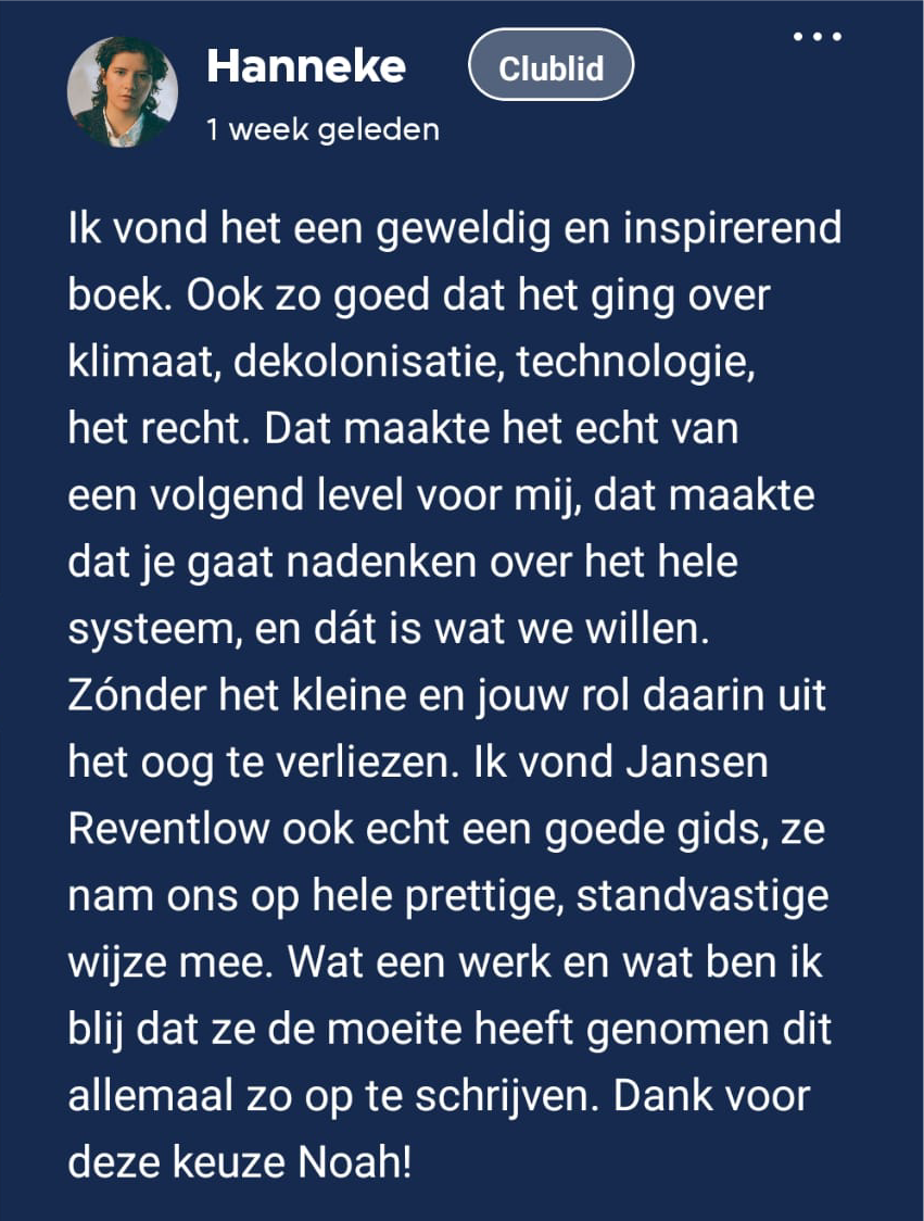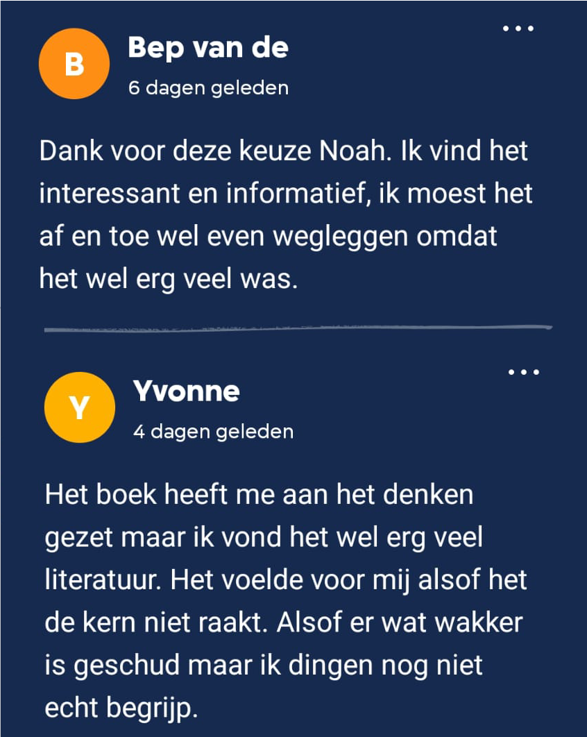 De reacties op Noah’s boekkeuze zijn ronduit positief. Hoewel non-fictie niet vaak gekozen wordt bij Club Lees, was dit boek een positieve verrassing. Mathijs: “Leuk hoe je zo via club lees in aanraking komt met heel veel verschillende vormen van literatuur”. Mara geeft aan dat het boek haar veel stof tot nadenken heeft gegeven. “Er stonden best veel feiten en cijfers in waar ik nog helemaal geen weet van had, dat vond ik heel fijn, om zo nieuwe dingen te leren!”, legt ze uit. “Bedankt dat je me uit m'n comfort zone hebt getrokken!”