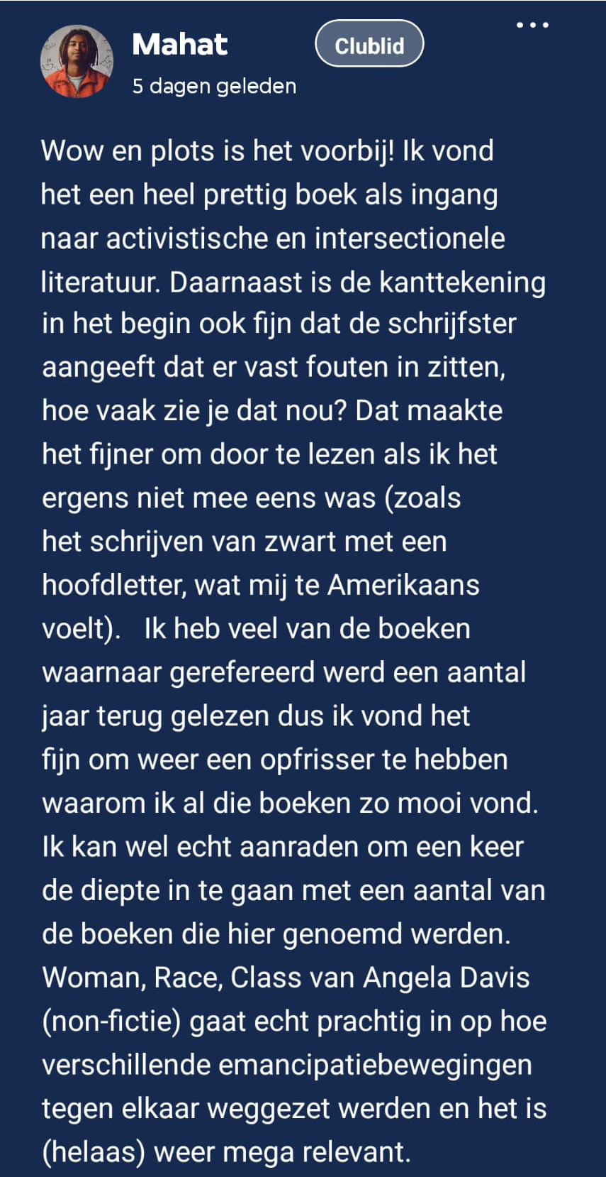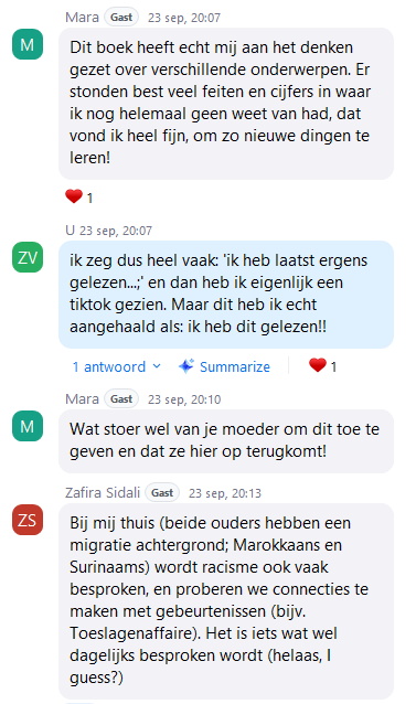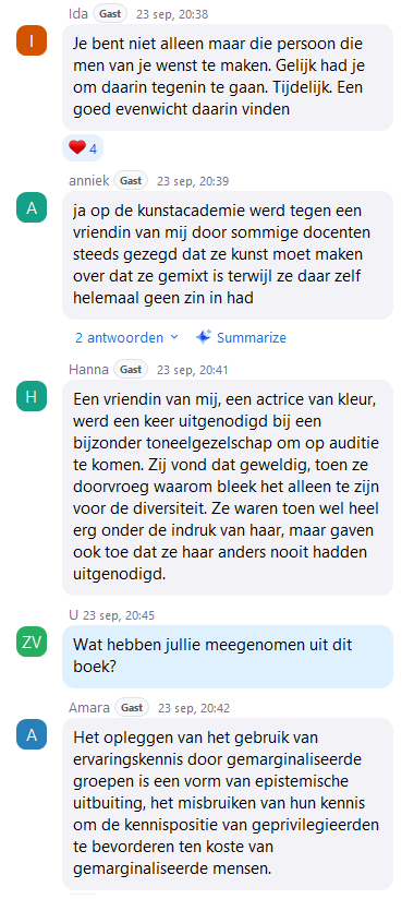 Het boek staat niet op zichzelf, maar geeft juist aanzetjes om met elkaar in gesprek te gaan en je verder te verdiepen in andere literatuur. Jansen Reventlow strooit met boekentips waar je verder mee kunt. Club Lees clublid Mahat bevestigt nog een paar van de boekentips: “Ik kan wel echt aanraden om een keer de diepte in te gaan met een aantal van de boeken die hier genoemd werden. Women, Race, Class van Angela Davis gaat echt prachtig in op hoe verschillende emancipatiebewegingen tegen elkaar weggezet werden en het is (helaas) weer mega relevant.” Tijdens de meetup op 23 september bleek ook hoe rijk het boek aan gesprekken is. Mensen deelden hoe er thuis over racisme wordt gesproken, of juist niet. Zafira vertelde dat het in haar gezien (met Marokkaanse en Surinaamse roots) bijna dagelijks onderwerp van gesprek is, vaak gelinkt aan actuele gebeurteniussen zoals de toeslagenaffaire. Ook man-vrouw en zwart-wit verhoudingen in ieders omgeving werden besproken. Matthijs: “Ik zit zelf op een hbo cabaret opleiding in Den Bosch, de verhouding man/vrouw is redelijk gelijk, maar op de hele school zitten misschien 2 mensen van kleur.”