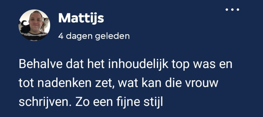 Naast de inhoud werd de schrijfstijl vaak genoemd. Mattijs is enthousiast: “Behalve dat het inhoudelijk top was en tot nadenken zet, wat kan die vrouw schrijven. Zo een fijne stijl.” Hanneke sluit zich helemaal aan bij de complimenteuze woorden van Mattijs: “Ik vond Jansen Reventlow ook echt een goede gids, ze nam ons op hele prettige standvastige wijze mee. Wat een werk en wat ben ik blij dat ze de moeite heeft genomen die allemaal zo op te schrijven.” Tessel noemt het een “fantastische” keuze voor Club Lees.