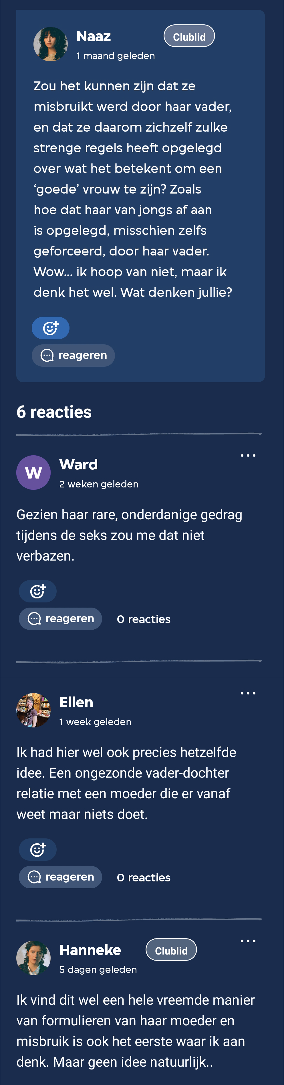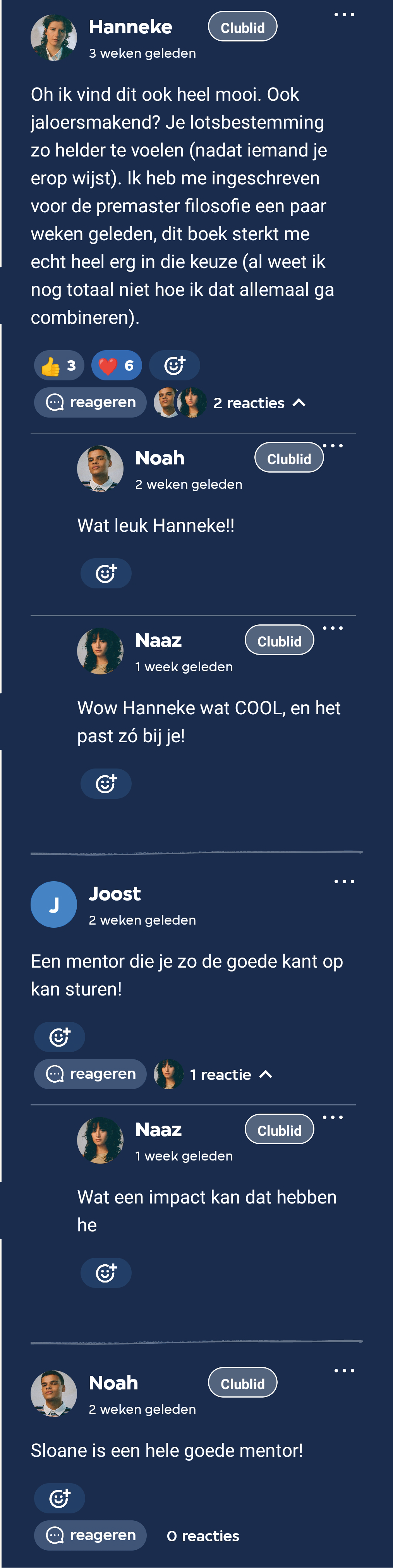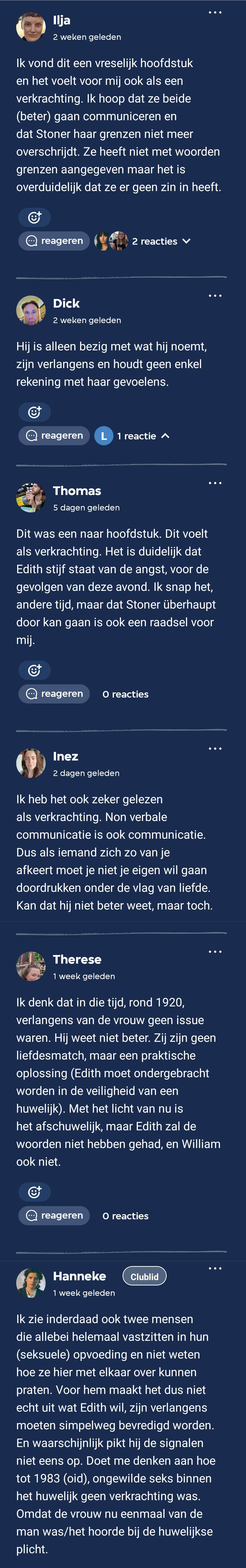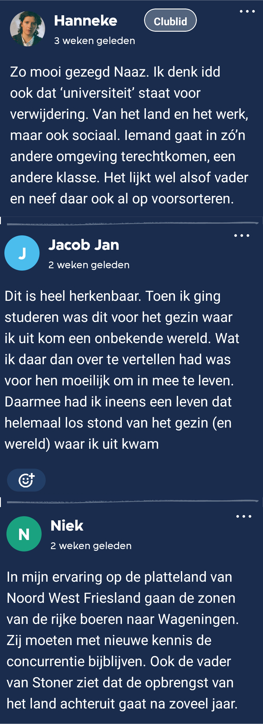 “Wacht eens even... het hele boek lang noem ik Stoner passief in mijn annotaties, maar wat als hij eigenlijk gewoon leeft volgens het stoïcisme? De definitie van stoïcisme is: een levensfilosofie waarin je leert omgaan met pijn, verlies en tegenslag door je emoties niet de overhand te laten nemen, en je vooral te richten op wat binnen je controle ligt. Misschien is dat precies wat Stoner doet, en is zijn passiviteit eigenlijk een vorm van kracht.” Naaz vroeg het de lezers in de meet-up, en de poll wees uit: 65% vond hem passief, 35% stoïcijns.