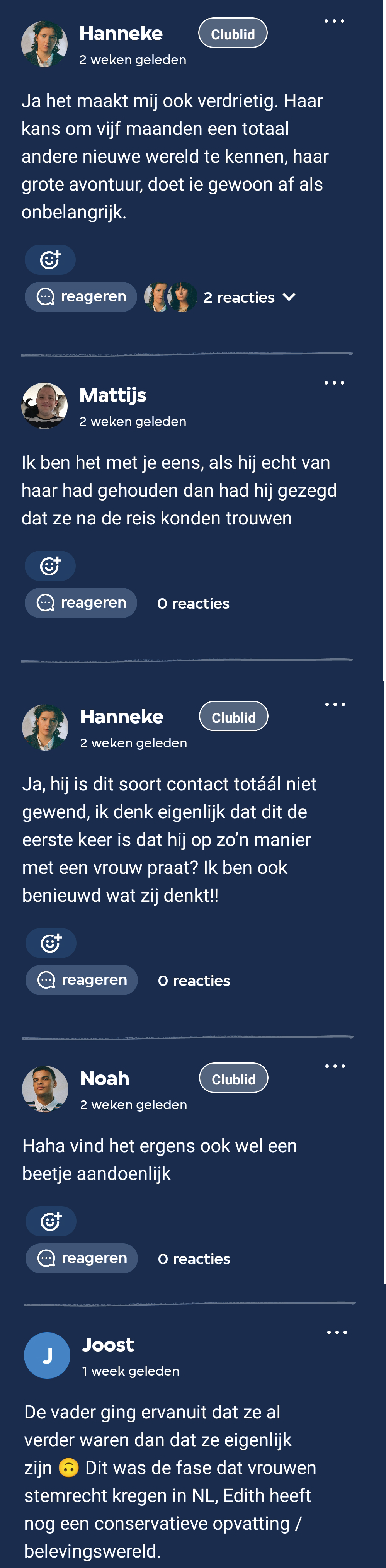 Stoner heeft ook een echtgenote, Edith. Hun huwelijk is op een wonderlijke manier begonnen, waarbij het niet helemaal duidelijk is of Edith wel écht met Stoner wilde trouwen. Naaz: “Ik vraag me dan af of ze uit properheid akkoord heeft gegeven of het echt wilde. Het lijkt niet alsof Stoner per se indruk op haar maakte.” Hanneke zag toch wel een connectie tussen de twee, maar volgens Joost lijkt er “weinig ruimte voor haar mening of gevoelens.”