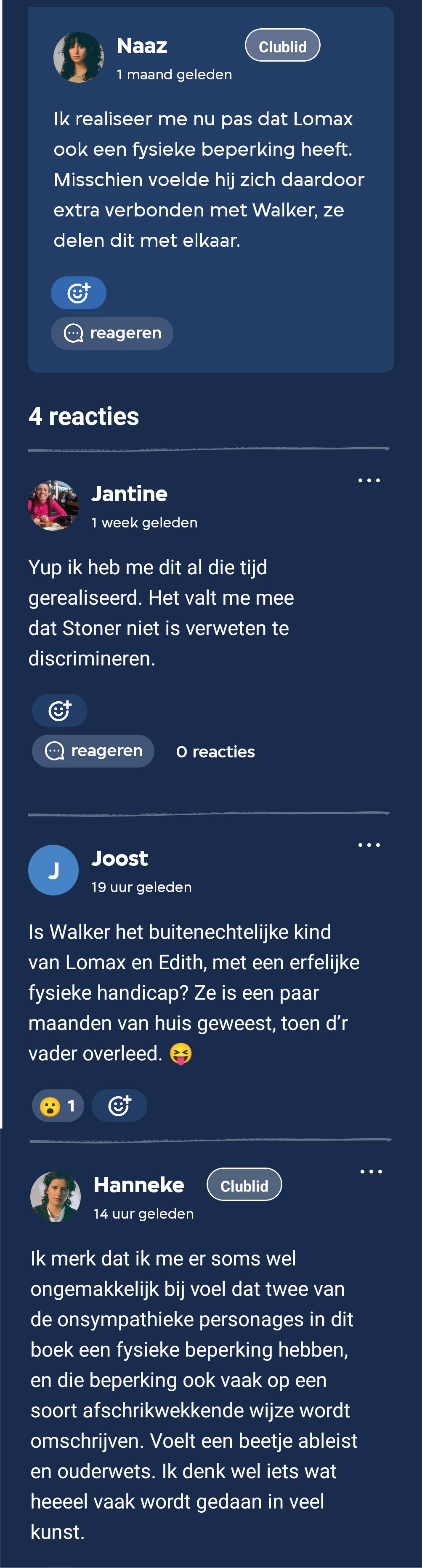 “Stoner observeert het alsof het allemaal buiten hem staat. Niet alleen personen, maar ook situaties; bijvoorbeeld de start van de oorlog deed hem aanvankelijk niets, en toen hij moest kiezen wat hij ermee moest doen, was het extreem lastig voor hem”, viel lezer Jacob Jan op. Meerdere lezers vonden het een passief karakter, of meer stoïcijns? Naaz merkt op: