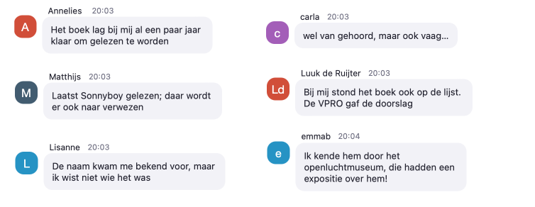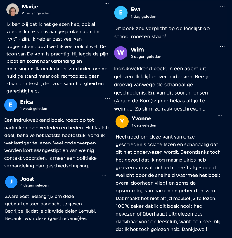 Het zesde boek dat we lazen met Club Lees werd gekozen door Lemuël: Wij slaven van Suriname van Anton de Kom. Een belangrijk boek over de slavernij in Suriname. Vijf weken lang (2 april 2024 – 5 mei 2024) werd er meegelezen door de app-gebruikers en de clubleden. Het boek werd verrijkt met annotaties van Lemuël; deze genereerden mooie gesprekken in de digitale kantlijn. Op 1 mei vond de online meetup plaats, waarin de clubleden en de lezers met elkaar in gesprek gingen. We zetten de mooiste leesmomenten op een rijtje.