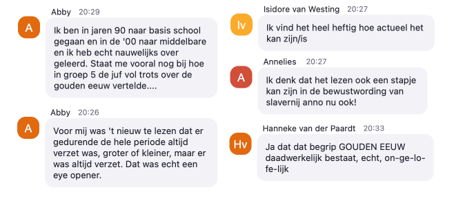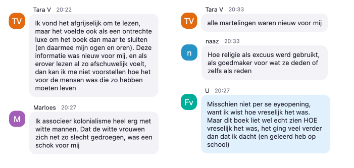 Ook Noah vond het boek confronterend. “Ik vind de geschiedenis van het koloniaal verleden van Nederland moeilijk om te lezen, omdat het te dichtbij komt. Ik las altijd wel over de Amerikaanse verhalen, maar dit was de eerste keer dat ik een boek uit heb gelezen dat over de Nederlandse geschiedenis ging.” Hij ziet ook sterk de link met racisme in de tegenwoordige tijd, een thema waar hij veel mee bezig is. “Ik heb laatst gelezen dat ik waarschijnlijk niet de dag ga zien dat racisme drastisch vermindert, dus dan wil ik zorgen dat het voor de komende generaties beter wordt.”