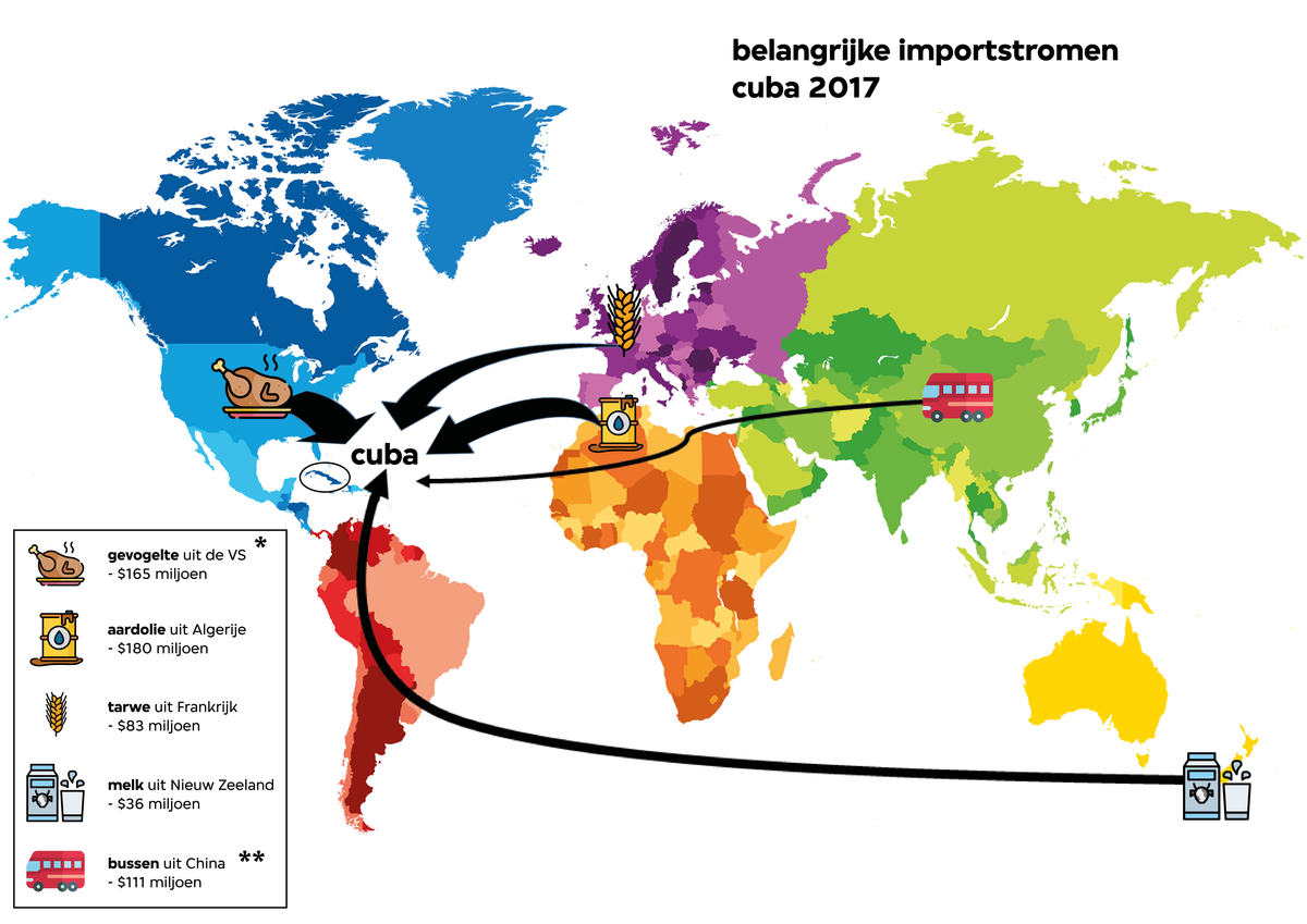 In het kaartje hiernaast zijn vijf van Cuba’s grootste importproducten te zien, de landen waar die grotendeels vandaan worden gehaald en hoeveel geld Cuba aan de import ervan kwijt was (in 2017). Wat daarbij het meest opvalt is dat gevogelte, dat met vier procent van de totale import het allergrootste importproduct van Cuba is, voor 67 procent toch uit Amerika wordt geïmporteerd. En wat moet Cuba met al die bussen uit China?