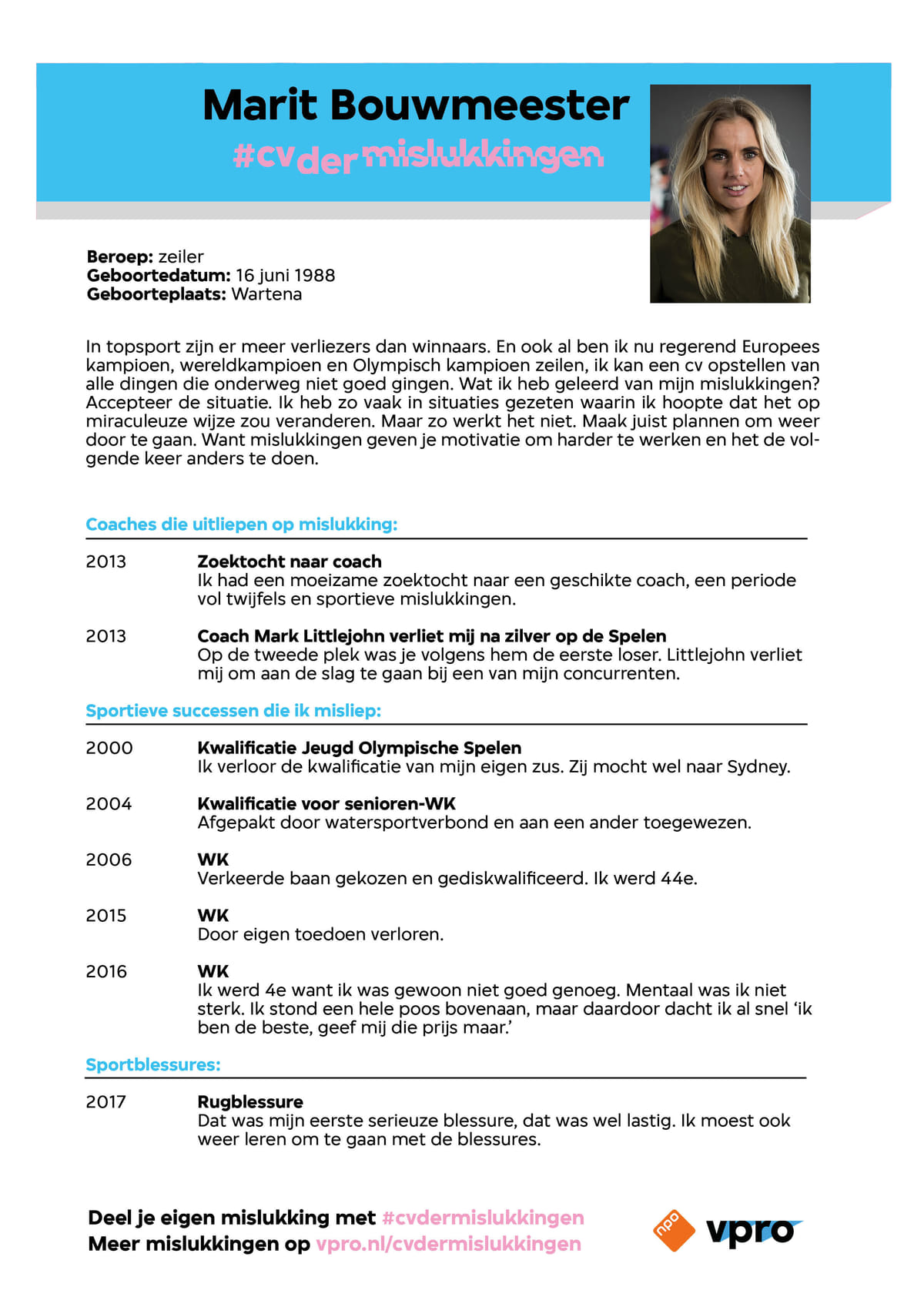 Marit Bouwmeester is de beste zeiler ter wereld. Ze legde een lange, moeizame weg af om daar te komen. Voor cv der mislukkingen vertelt Bouwmeester over de schijnbare mislukkingen die haar hebben gemaakt tot wie ze nu is.