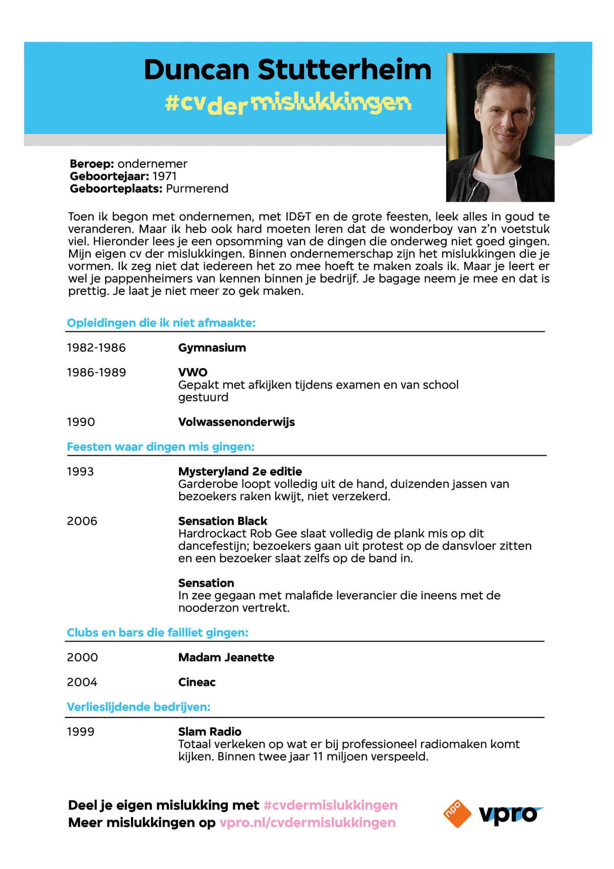 Alles wat ondernemer Duncan Stutterheim (1971) aanraakt, verandert in goud: van partyorganisatie ID&T tot de A’DAM Toren. Tenminste, zo lijkt het, maar is dit ook zo? Op verzoek van de VPRO dook Stutterheim in zijn verleden, op zoek naar de schijnbare mislukkingen die hem hebben gemaakt tot wie hij nu is.