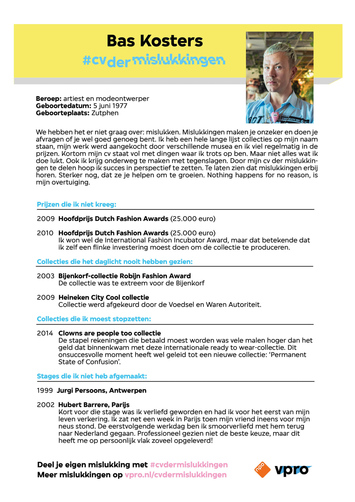 Modeontwerper en kunstenaar Bas Kosters heeft met succes een herkenbaar eigen universum neergezet. Kleurrijk en extravagant, maatschappelijk en sociaal bewogen; van kleding en kinderwagens tot poppen en illustraties. Maar geen succes zonder tegenslag, weten we. Voor de VPRO dook hij op verzoek in het verleden: schijnbare mislukkingen die Kosters hebben gemaakt tot wie hij nu is.