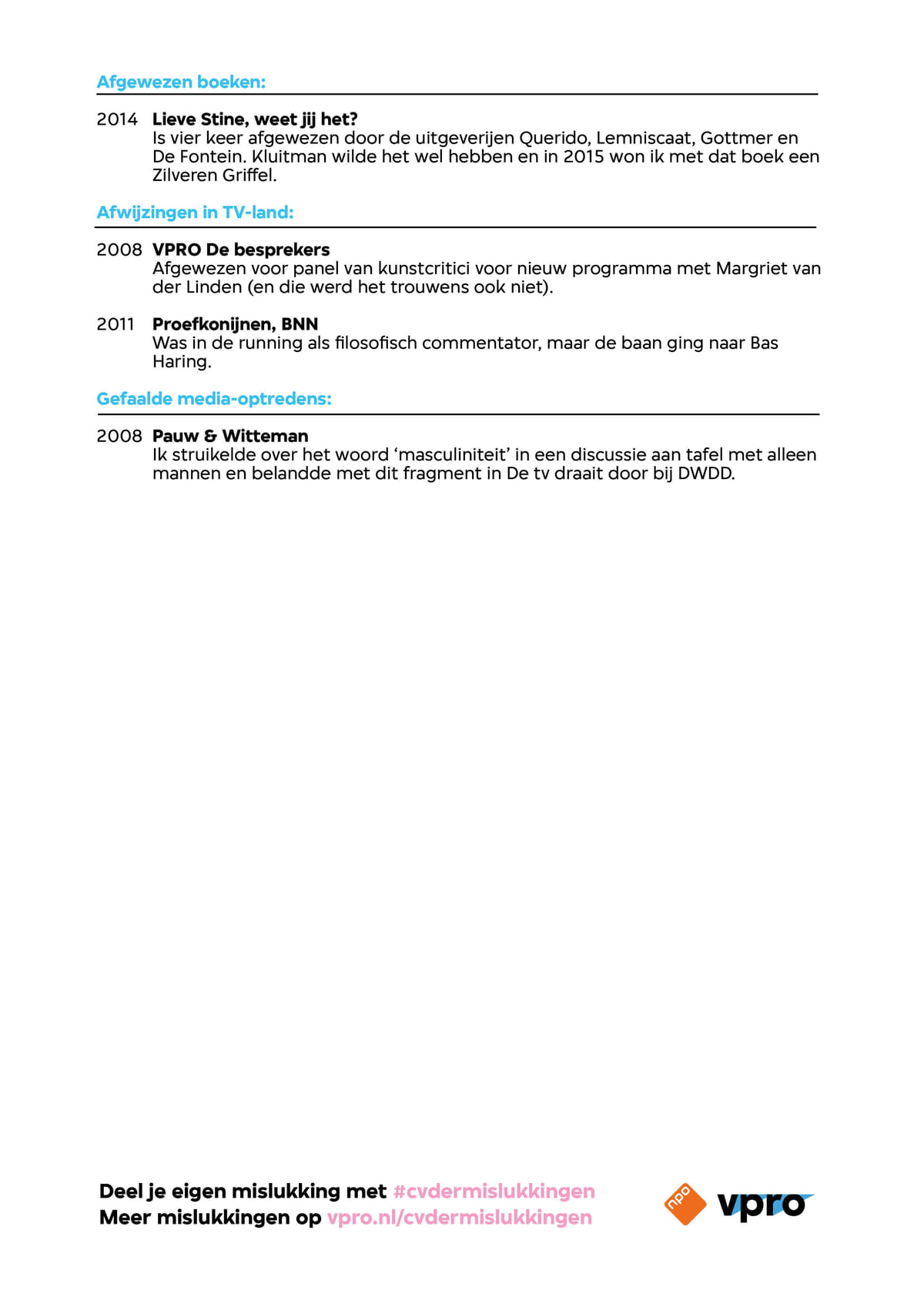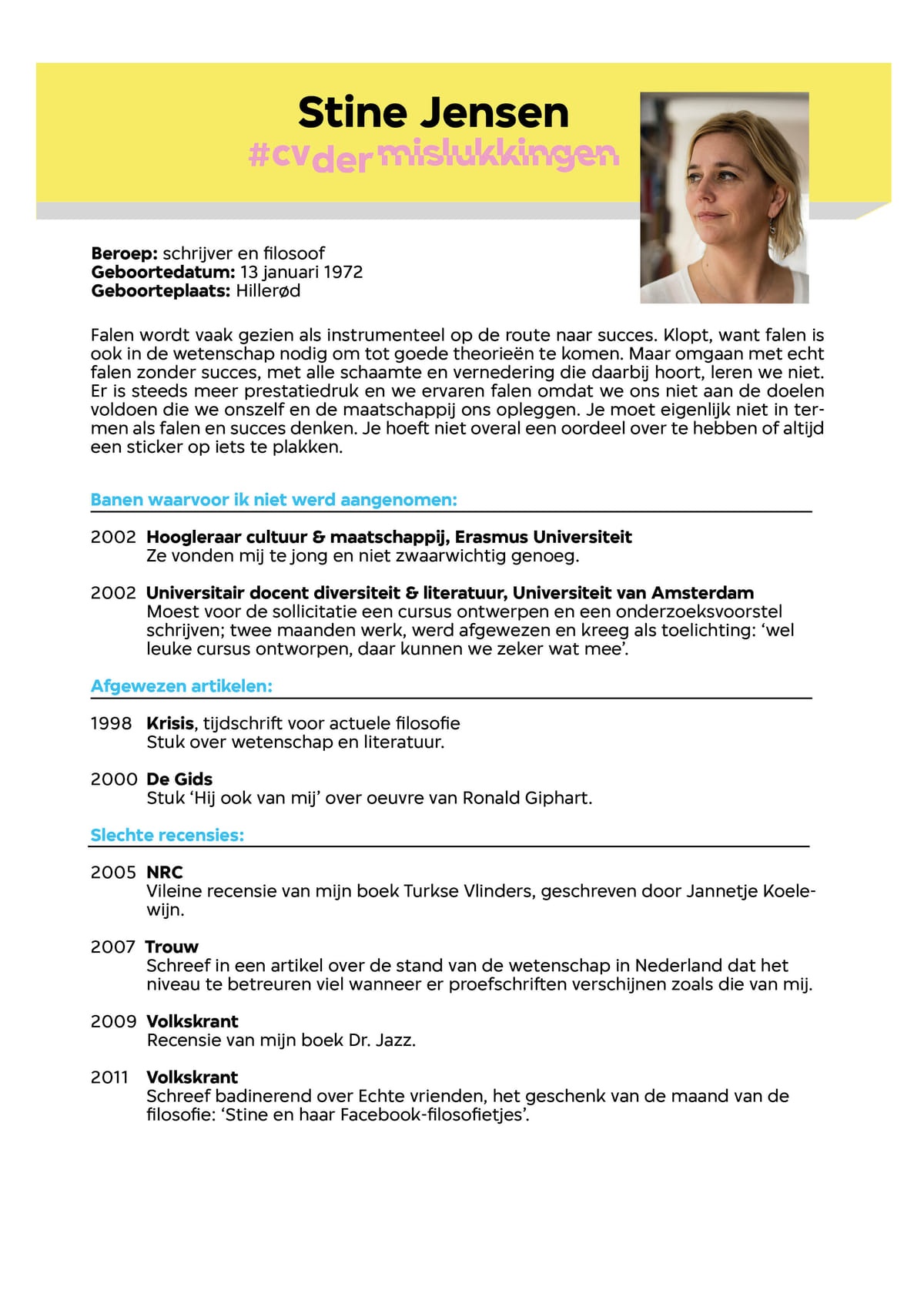 Falen wordt vaak gezien als instrumenteel op de route naar succes. Klopt, want falen is nodig om tot goede wetenschappelijke theorieën te komen. Maar omgaan met echt falen zonder succes, met alle schaamte en vernedering die daarbij hoort, leren we niet. Er is steeds meer prestatiedruk en we ervaren falen omdat we ons niet aan de doelen voldoen die we onszelf en de maatschappij ons opleggen. Je moet eigenlijk niet in termen als falen en succes denken. Je hoeft niet overal een oordeel over te hebben of altijd een sticker op iets te plakken.’