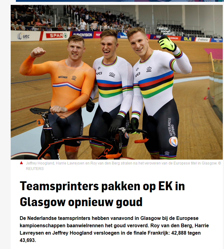 Roy van den Berg, Harrie Lavreysen en Jeffrey Hoogland verslaan Frankrijk in de finale van het EK Baanwielrennen in Glasgow.
