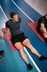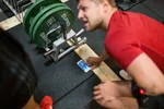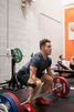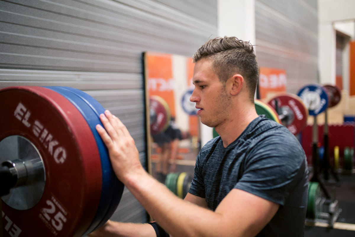 Het krachthonk is niet groot, maar de ego’s van deze baanwielrenners wel. De zes jongens slepen met gewichten en klemmen en een apparaatje om hun arm. Iedereen traint met andere gewichten, maar via een app zien ze wie zijn gewicht met de meeste versnelling omhoog sleurt.