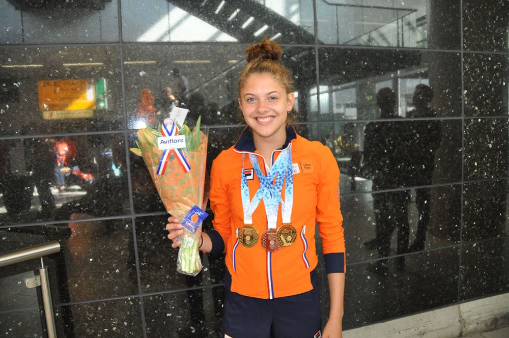 Een first voor Zoë: in 2017 mag ze meedoen aan het Europees Jeugd Olympisch Festival (de EYOF) in Hongarije en da’s haar eerste internationale toernooi. Dat betekent zenuwen en veel nieuwe gezichten, maar daar is niks van te merken in Zoë haar races. In 23.74 snelt ze naar het goud op de 200 meter sprint, Zoë loopt sneller dan Dafne Schippers op die leeftijd! Kijk hier hoe blij Zoë is na haar gouden race op de 200 meter sprint: