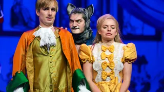 Don Duyns: ‘Regisseur Pieter Kramer en ik gaan voordat we aan zo’n project als dit beginnen samen naar Londen. Daar bezoeken we een paar voorstellingen om op ideeën te komen. Puss in Boots was er daar een van, maar het verhaaltje over die gelaarsde kat is natuurlijk veel te dun voor een tweeënhalf uur durende bewerking. Dus kijken we waarmee we dat eerste uitgangspunt allemaal kunnen combineren, wat niet-alledaagse vraagstukken tot gevolg heeft als: voegen we er een reus, zieke elf of goblin aan toe? Zo kwam onder anderen James Blond erbij, gespeeld door Arjan Ederveen, als bodyguard van de prinses en met de theatrale mogelijkheden van gadgets. Het uiteindelijke resultaat is iets als de wereld van Anton Pieck versus die van mannen met pistolen.’