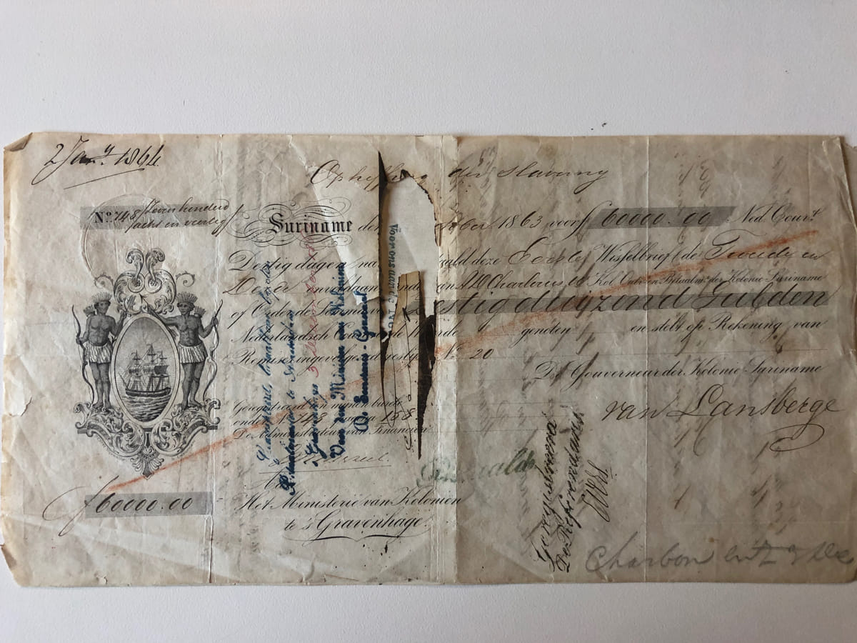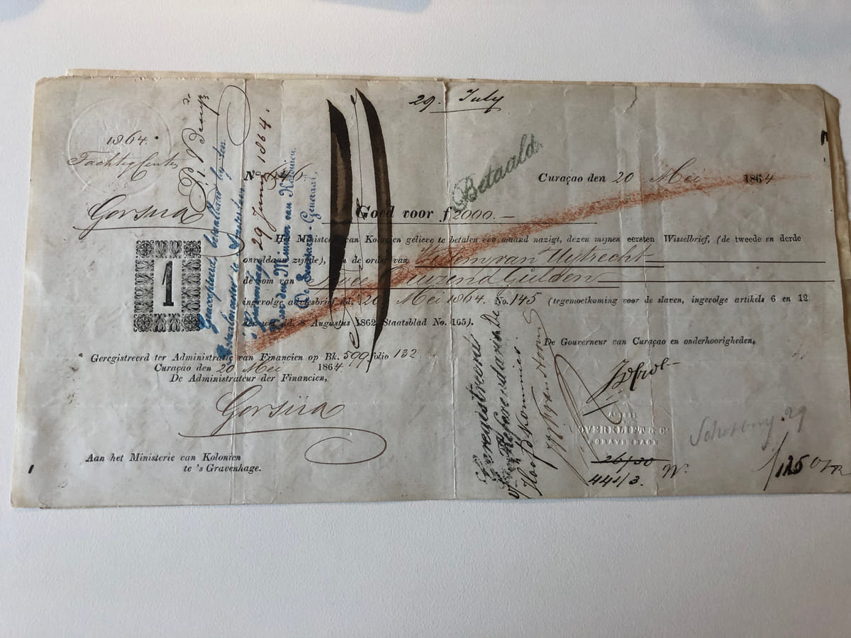 Een voorbeeld. Esajas staat op om iets te pakken en komt terug met een document in een stukje plastic, een zogeheten wisselbrief. Plantage-eigenaren kregen bij de afschaffing van de slavernij van de overheid compensatie van hun inkomstenderving, toen hun slaven vrij werden gelaten. Met dit stukje papier konden de eigenaren naar de bank en dan kregen ze tussen de 100 en 300 gulden compensatie – het afgesproken bedrag staat op de wisselbrief.