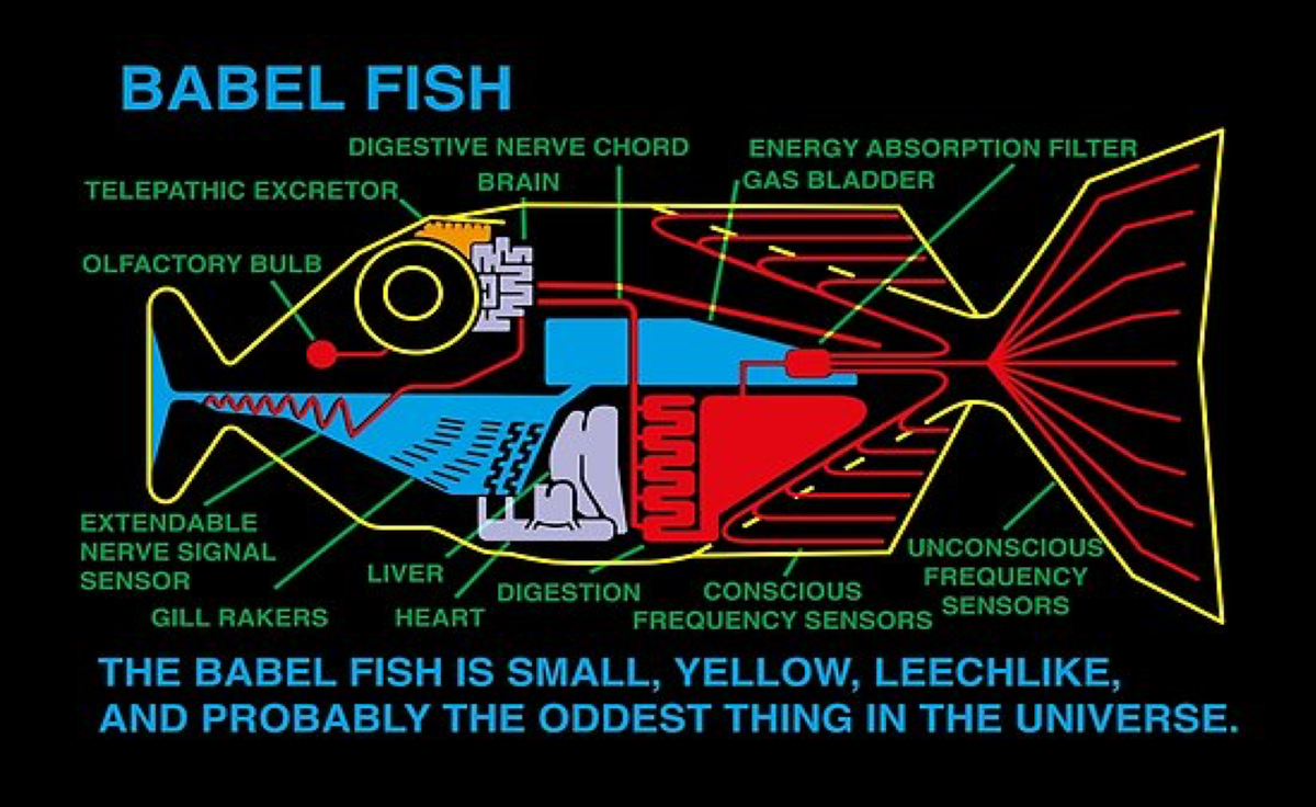 Een van de bekende verzinsels uit The Hitchhiker’s Guide to the Galaxy is de Babel fish: een visje dat, wanneer je het in je oor stopt, elke taal die je hoort direct kan vertalen naar jouw eigen taal. In 2017 bracht Google oortjes op de markt die precies dit doen: ze luisteren naar gesproken tekst en een synthetische stem spreekt de vertaling in je oor uit. Maar taal is complex, dus vooralsnog werkt het alleen met eenvoudige zinnen. In 1997 kreeg de eerste gratis vertaalwebsite ook de naam 'Babelfish', die in 2012 werd vervangen door Bing.