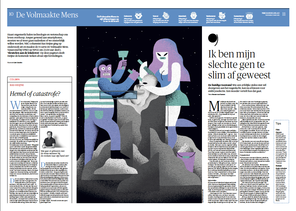 Een baby gemaakt uit drie ouders, met één pil een traumatische herinnering wissen, met laserlicht iemands gedrag sturen of menselijke organen opkweken in varkens. Geen sciencefiction, maar realiteit. In de zesdelige Human/VPRO serie De Volmaakte Mens (2015) gaat schrijver en columnist Bas Heijne op zoek naar de toekomst van onze soort.