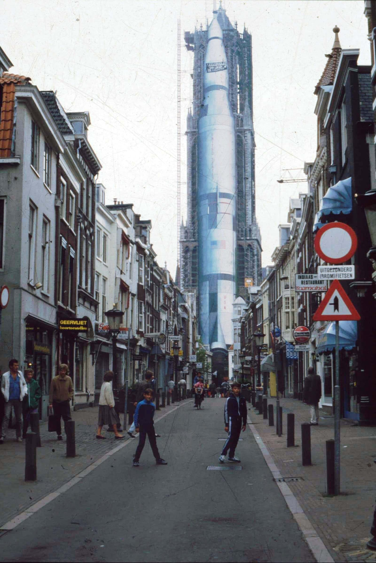‘Mwwah. In het begin alleen bij Het Parool en later, rond de maanlanding, kwam Chriet Titulaer erbij. Chriet en ik zaten elkaar wel een beetje in de haren. Tegelijk met mij wilde hij in Nederland een ruimtevaartexpositie organiseren Hij wist dat ik al met de Russen bezig was, maar Chriet wilde de Russen ook hebben. Hij heeft toen een poging gedaan om Russisch ruimtevaartmateriaal voor zijn expo te krijgen en is daarvoor ook naar Moskou gegaan. Maar de Russen zeiden: neem maar contact op met Piet. Uiteindelijk zijn er twee exposities gekomen. Space ’86 van Chriet in de Jaarbeurs in Utrecht over de Amerikaanse ruimtevaart en een veel grotere van mij in de Efteling. Interkosmos, over de Russische ruimtevaart. Dat was de eerste in het Westen. In Utrecht werd Space ’86 onder de aandacht gebracht met een maanraket op ware grootte. 110 meter, tegen de Dom.’