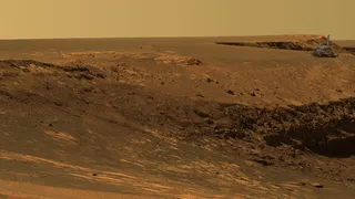 Marsrover Opportunity heeft daar in oktober 2006 echt gestaan, op de rand van de Victoria-krater. Alleen was er niemand om de foto te nemen. Dat hebben ze bij NASA opgelost door het karretje te photoshoppen in een beeld dat het eerder zelf gemaakt had, op weg naar die plek. De foto is dus nét niet echt.